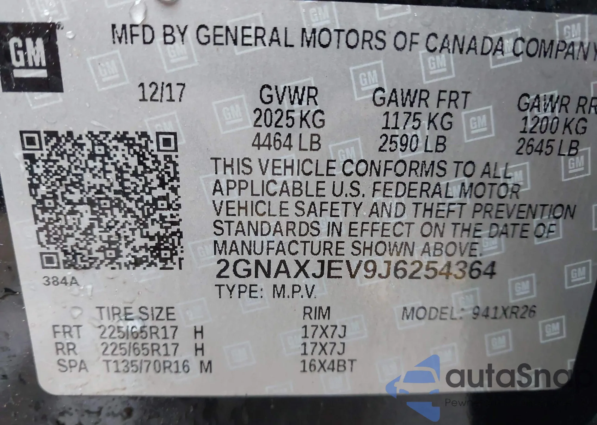 LOT: 43169161 VIN: 2GNAXJEV9J6254364