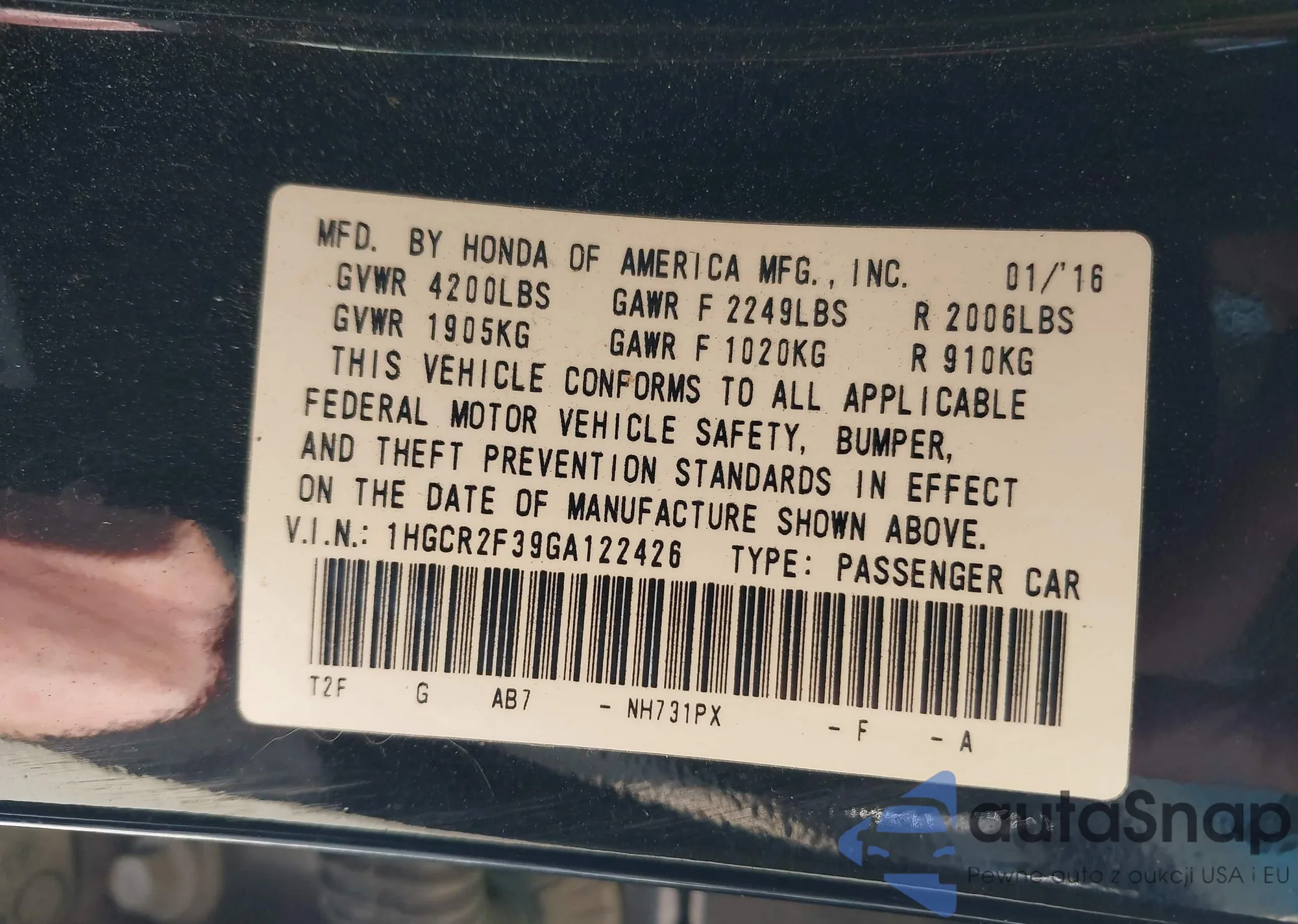 • VIN 1HGCR2F39GA122426