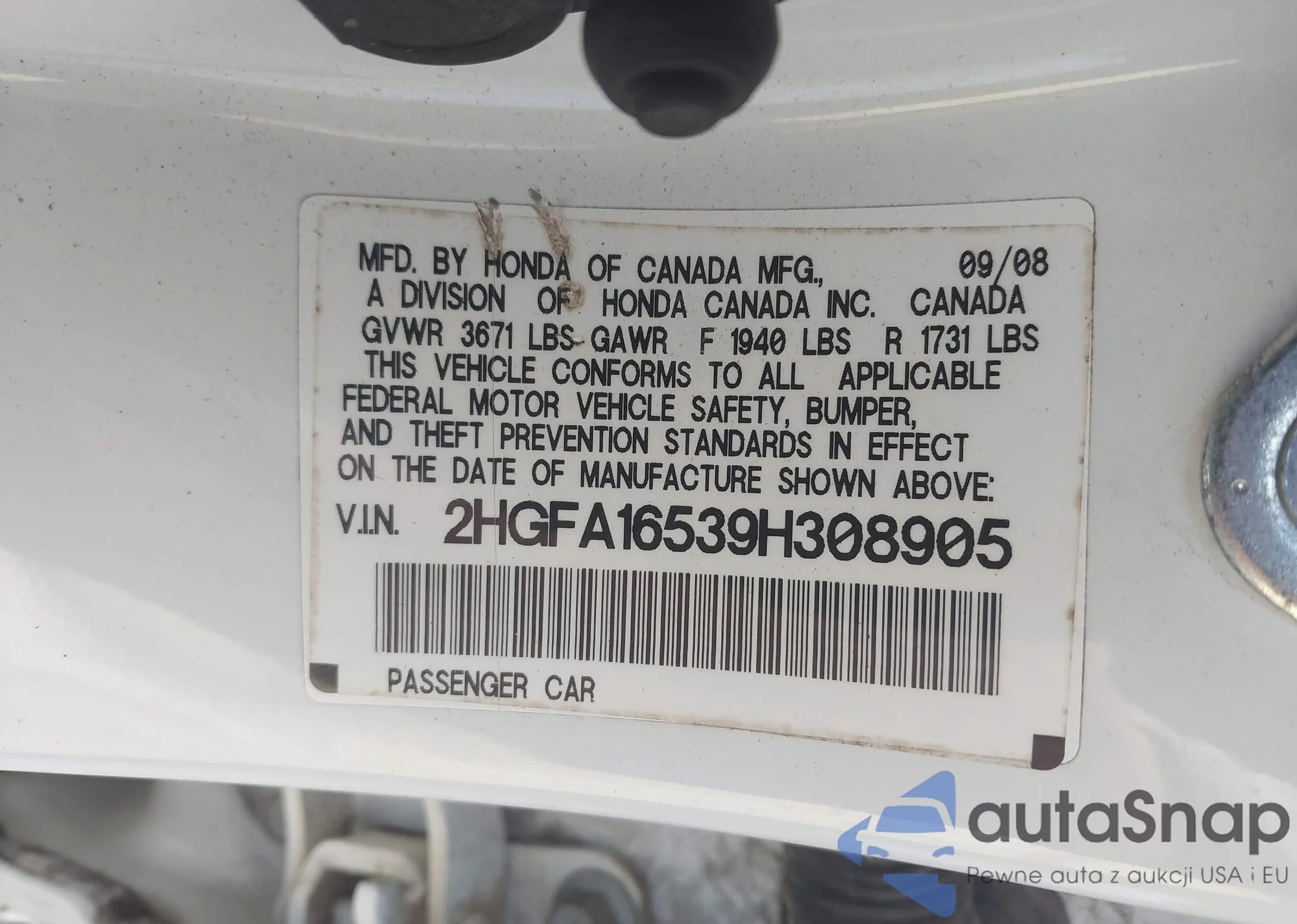 • VIN 2HGFA16539H308905