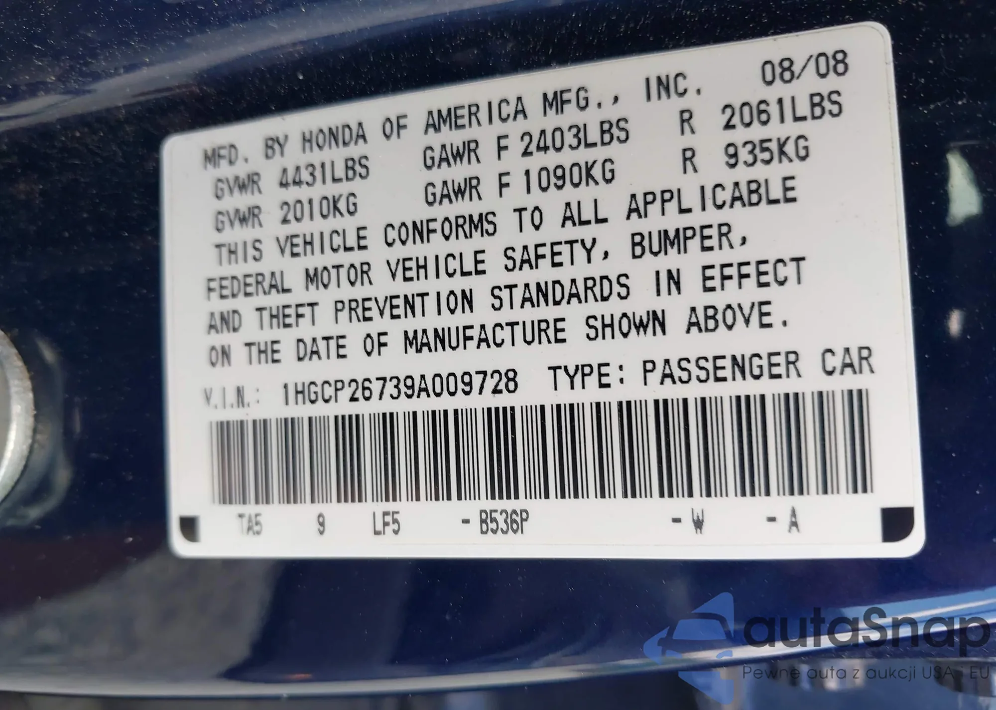 LOT: 43246207 VIN: 1HGCP26739A009728