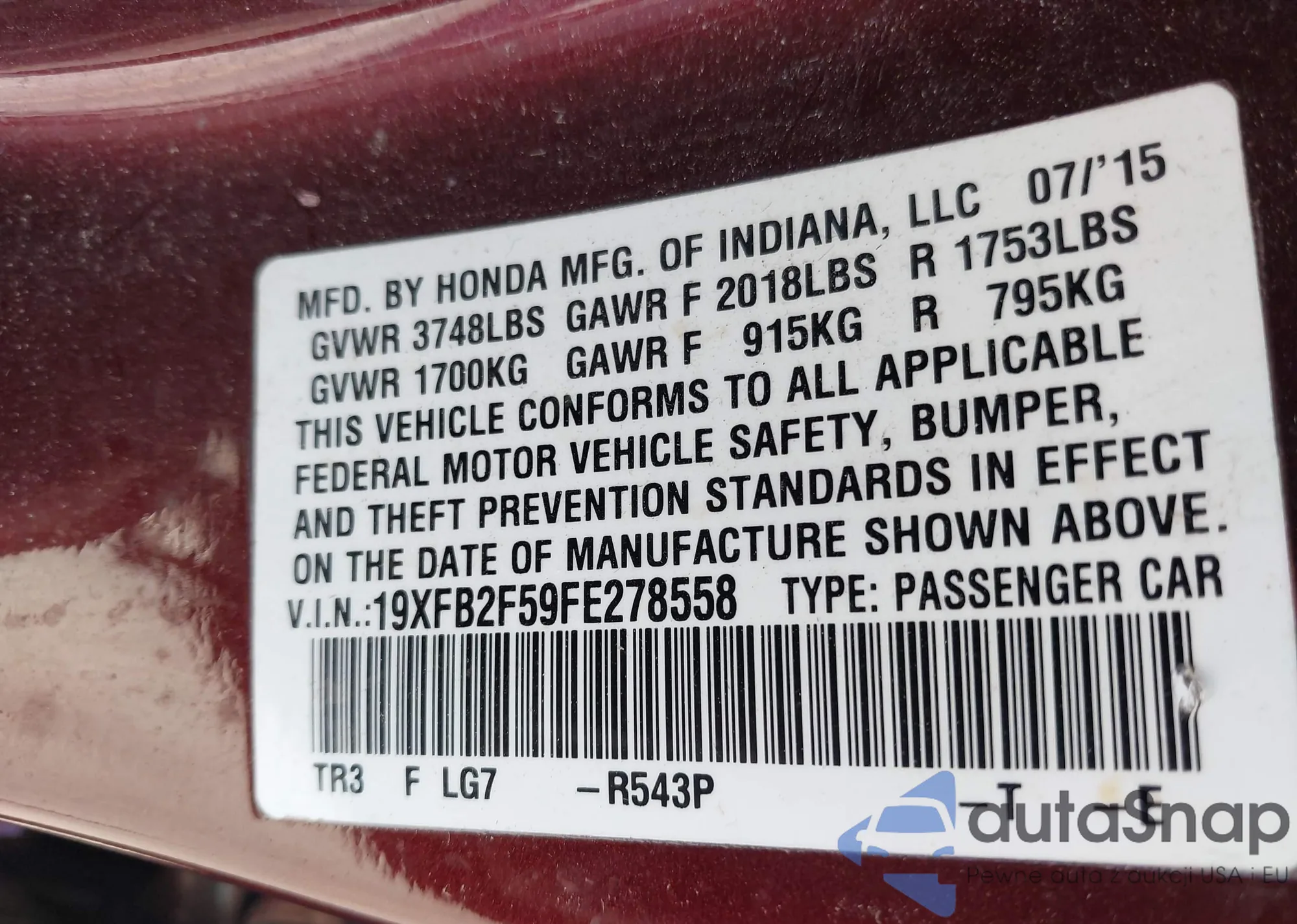 LOT: 43304369 VIN: 19XFB2F59FE278558
