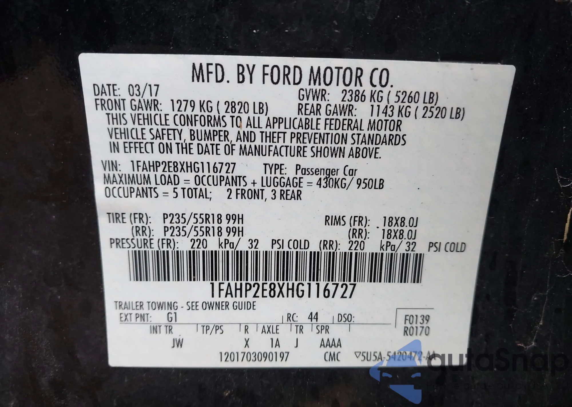 LOT: 43279046 VIN: 1FAHP2E8XHG116727