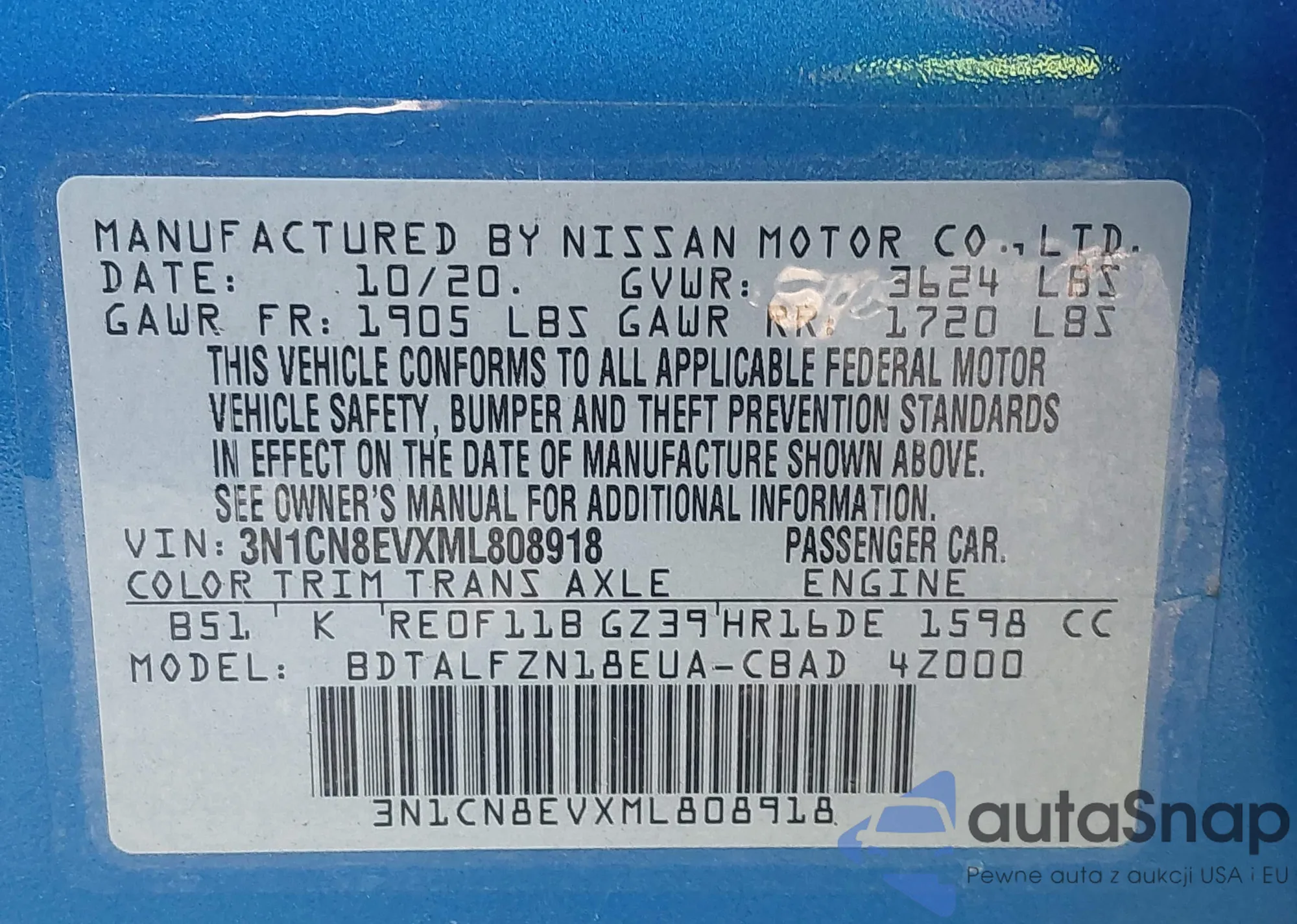LOT: 43371015 VIN: 3N1CN8EVXML808918