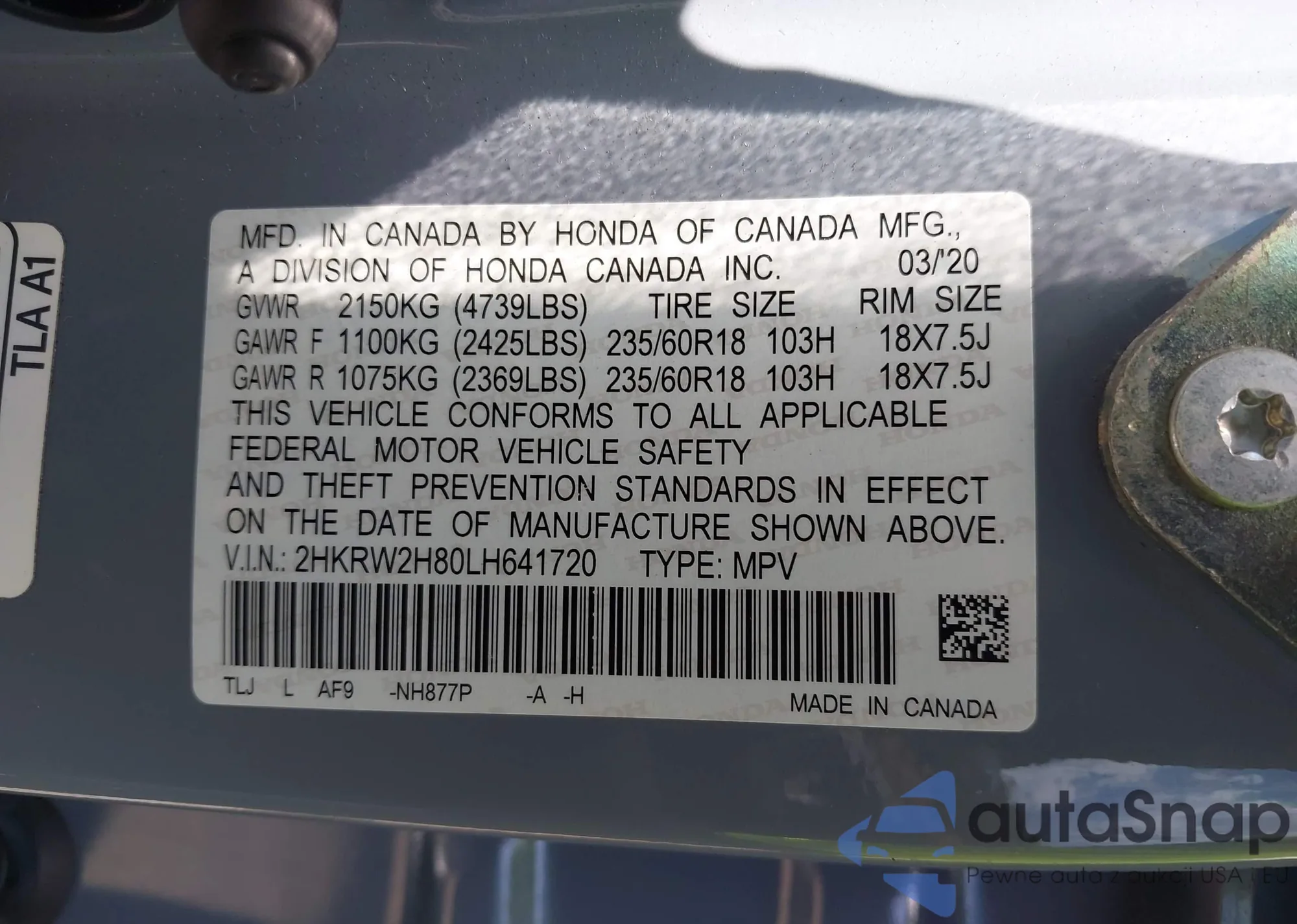 • VIN 2HKRW2H80LH641720
