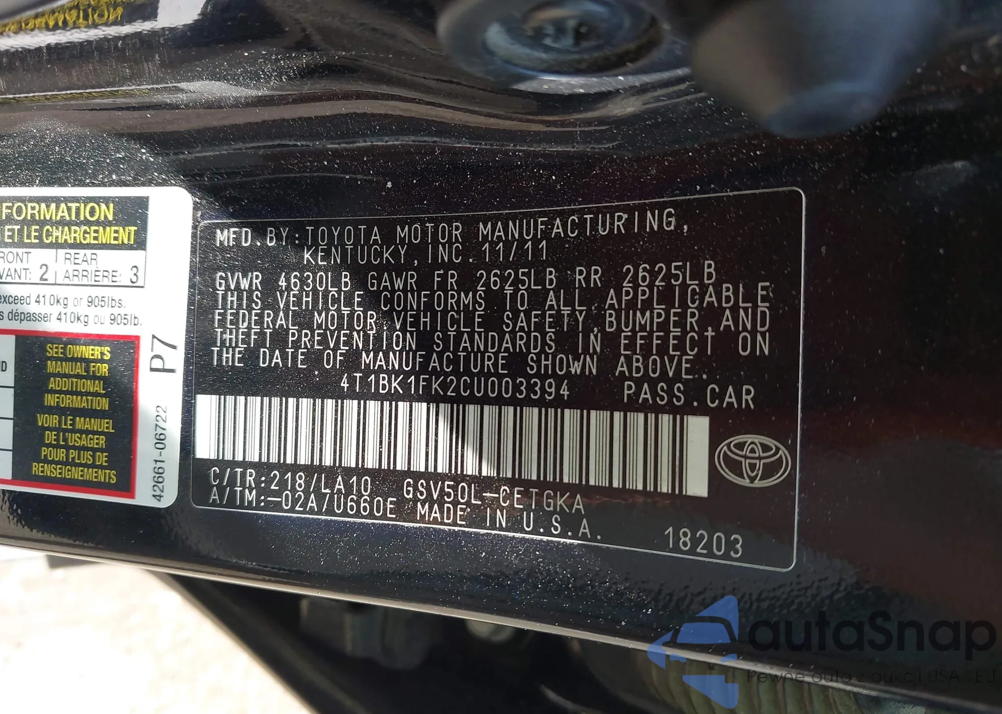LOT: 42694666 VIN: 4T1BK1FK2CU003394