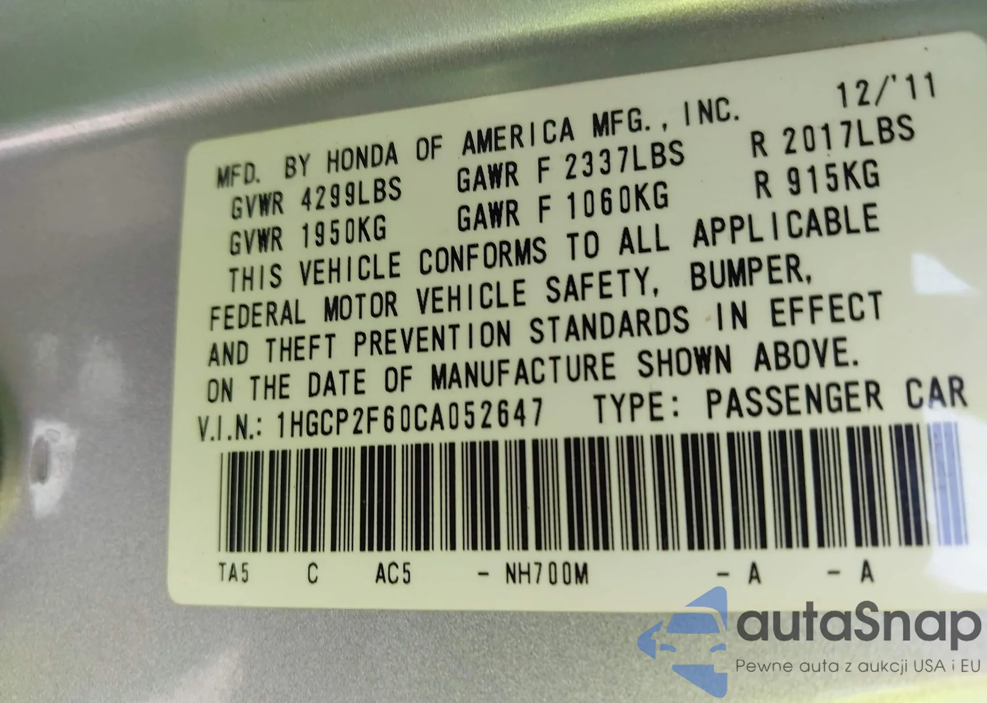 • VIN 1HGCP2F60CA052647