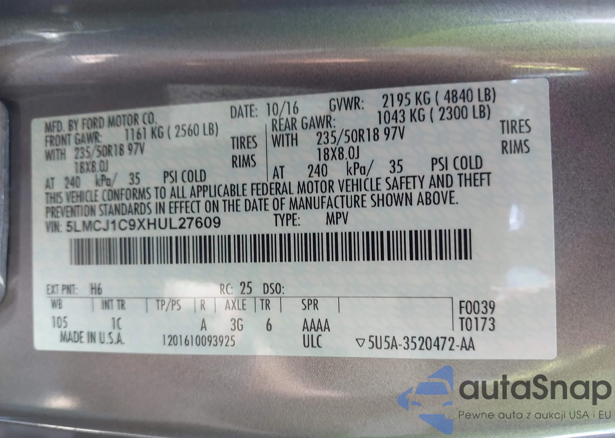 • VIN 5LMCJ1C9XHUL27609
