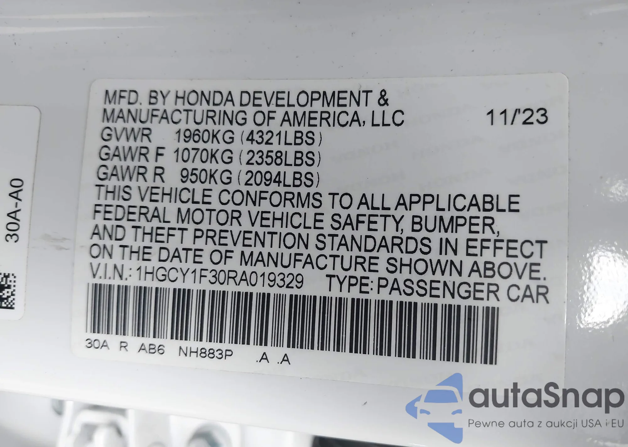 LOT: 42914349 VIN: 1HGCP2F60CA052647