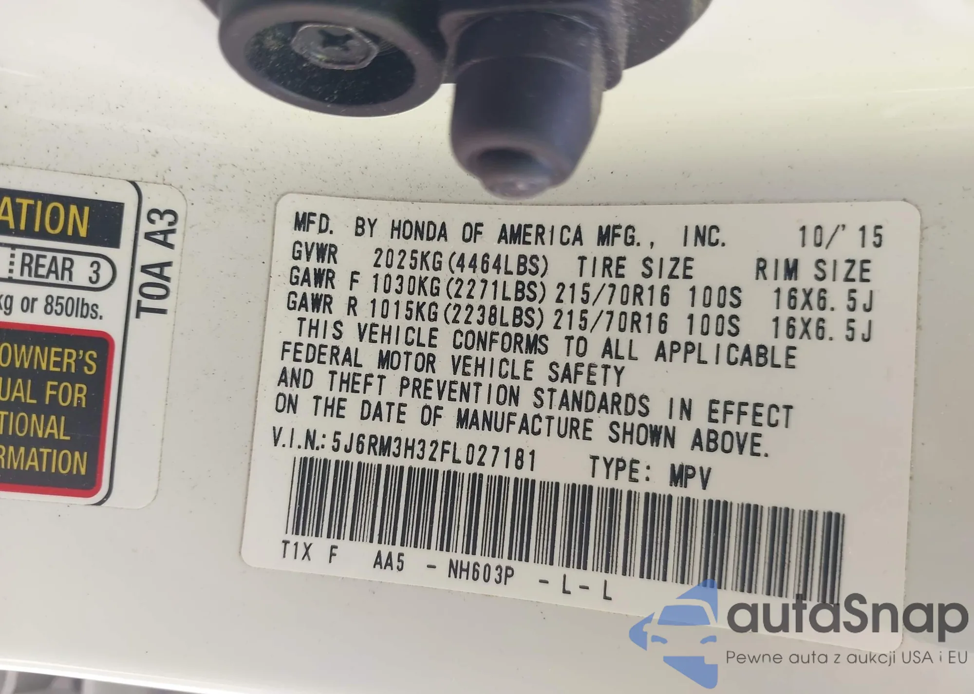 • VIN 5J6RM3H32FL027181