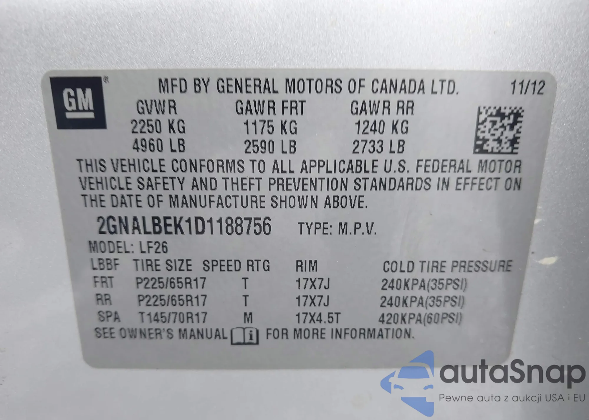 LOT: 43246502 VIN: 2GNALBEK1D1188756