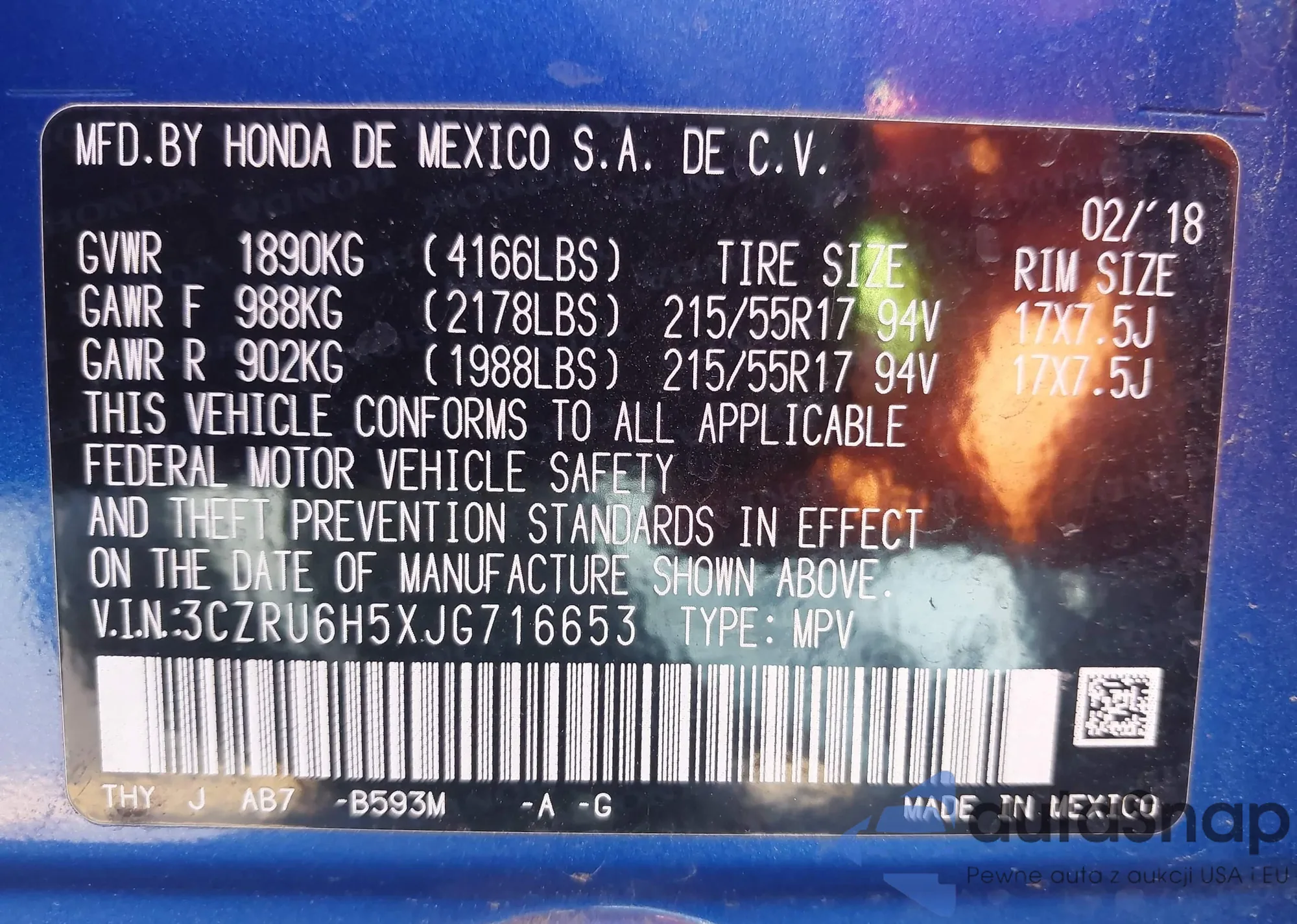 • VIN 3CZRU6H5XJG716653
