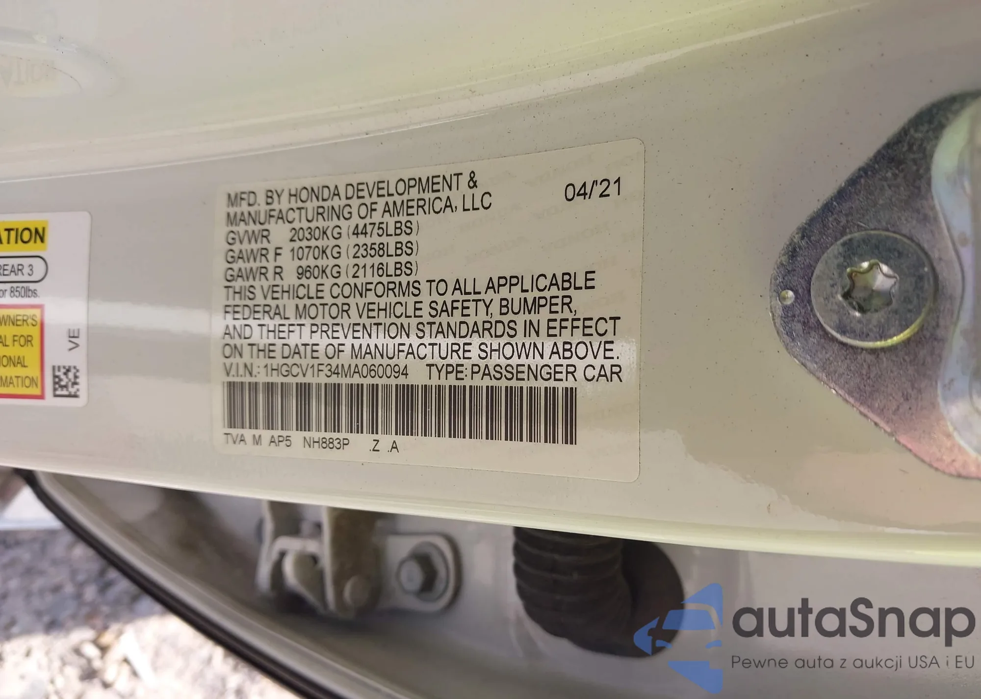LOT: 43275423 VIN: 1HGCV1F34MA060094