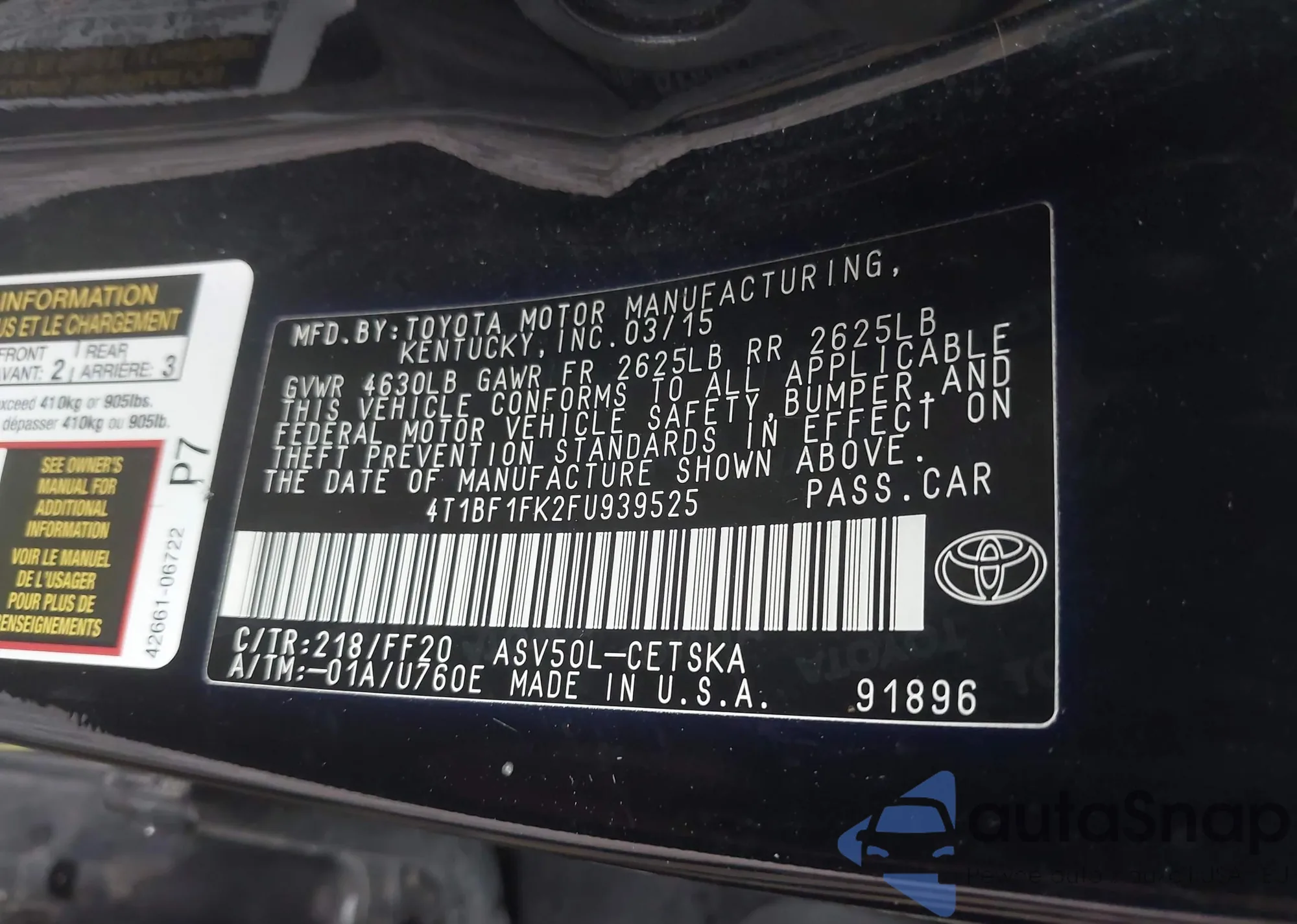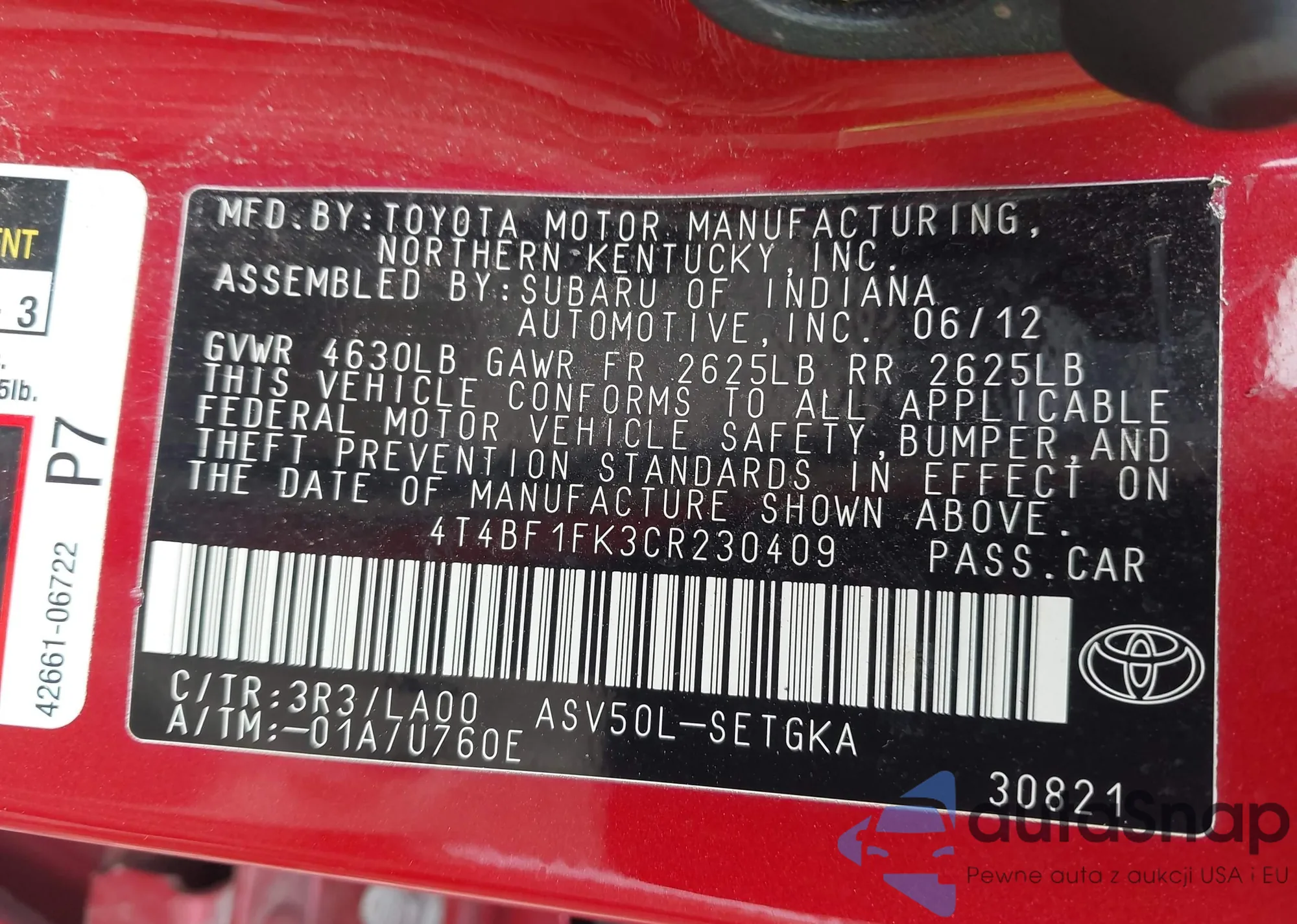 • VIN 4T4BF1FK3CR230409