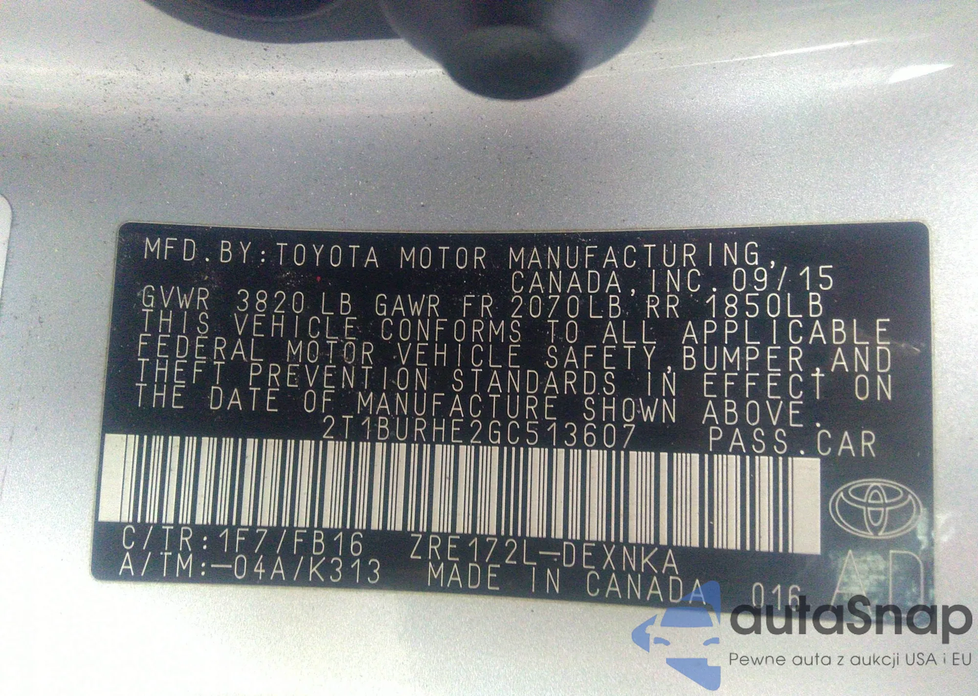 LOT: 36282445 VIN: 2T1BURHE2GC513607