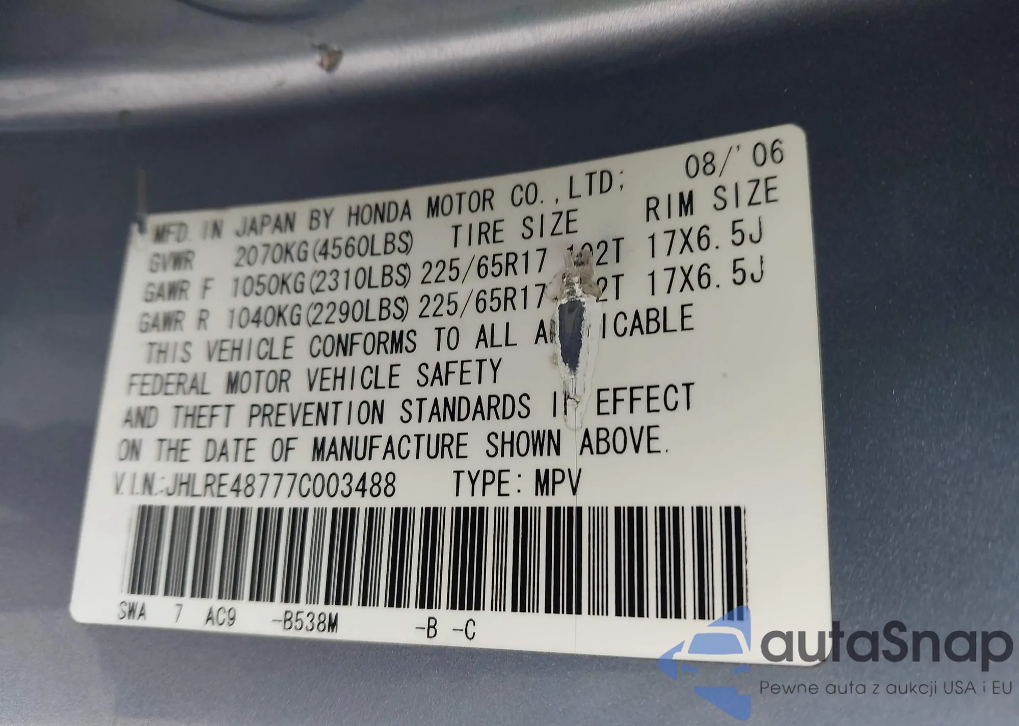 LOT: 43193384 VIN: JHLRE48777C003488