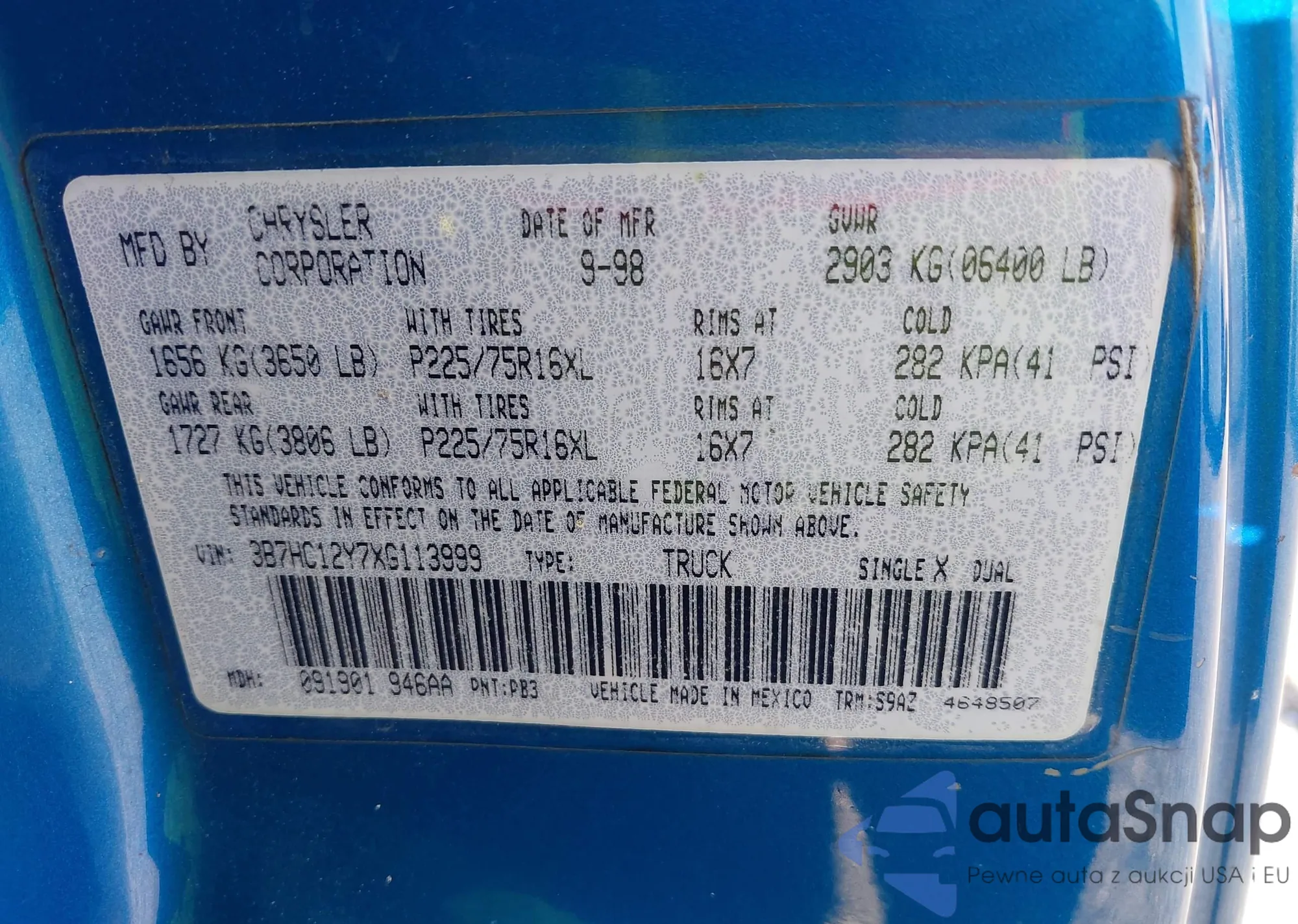 • VIN 3B7HC12Y7XG113999