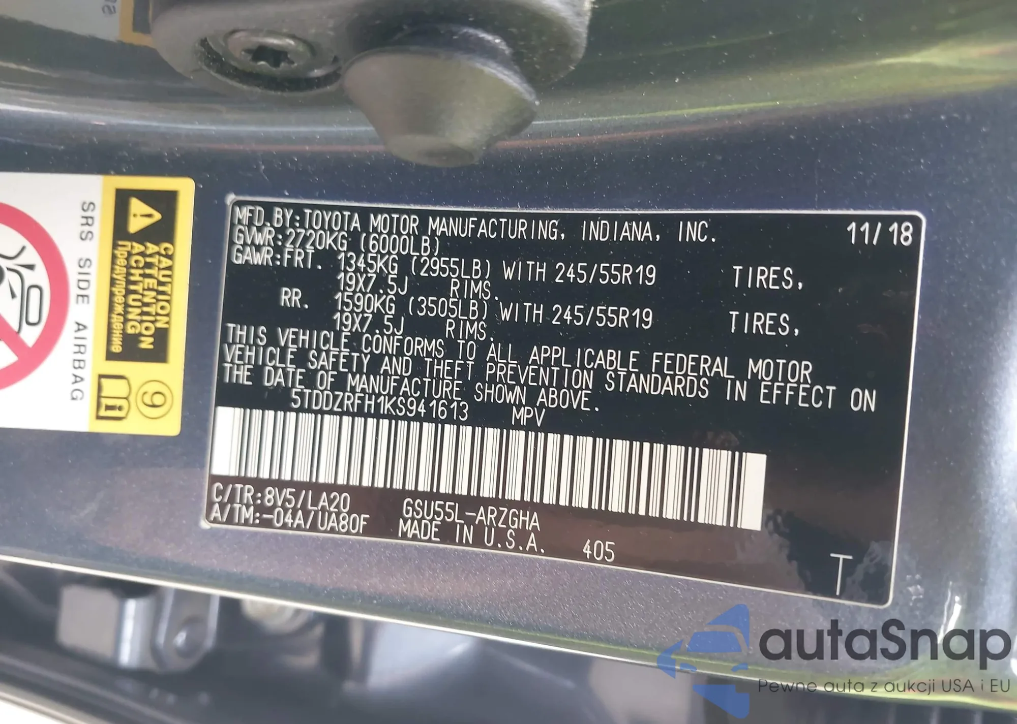 • VIN 5TDDZRFH1KS941613