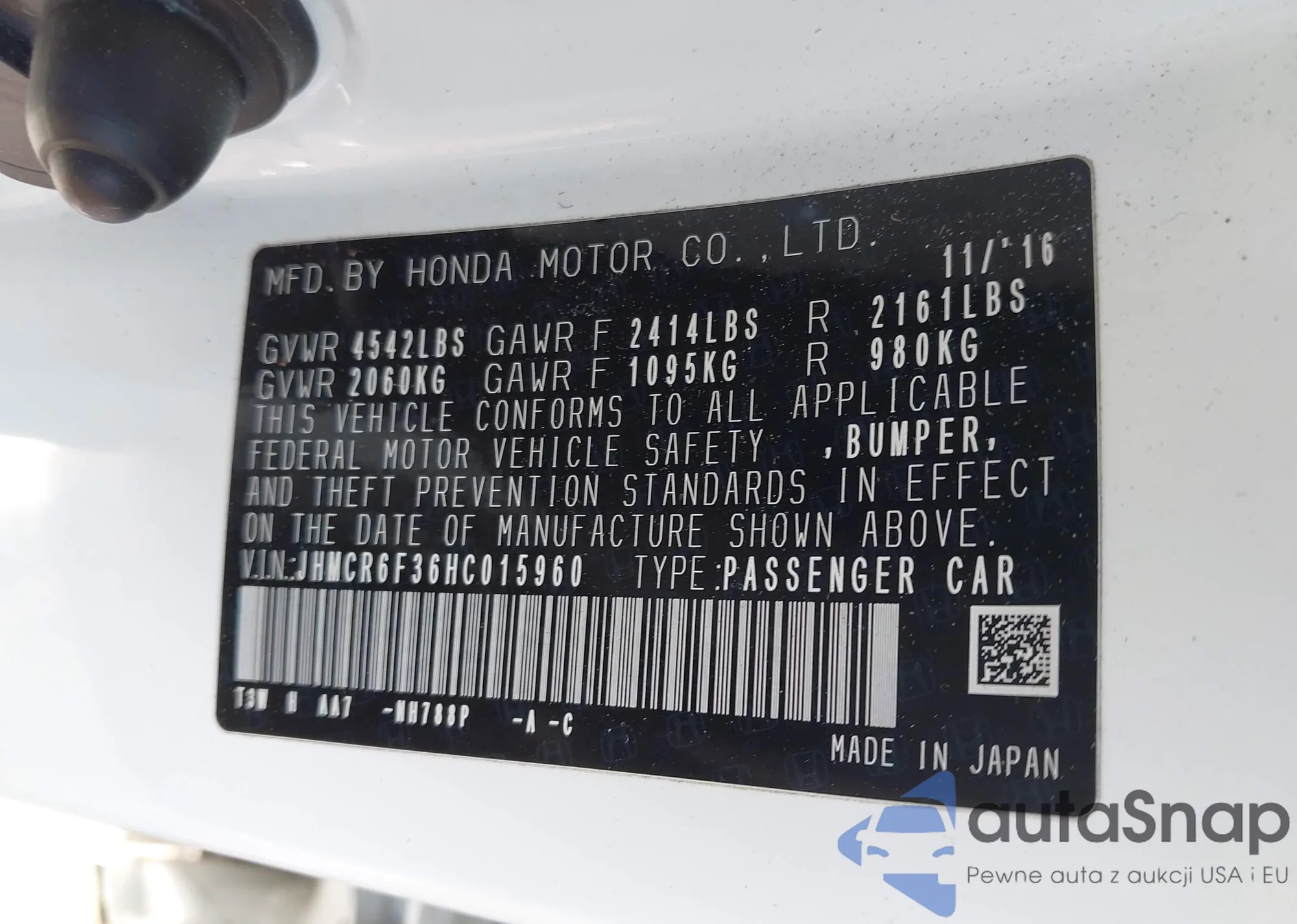 • VIN JHMCR6F36HC015960