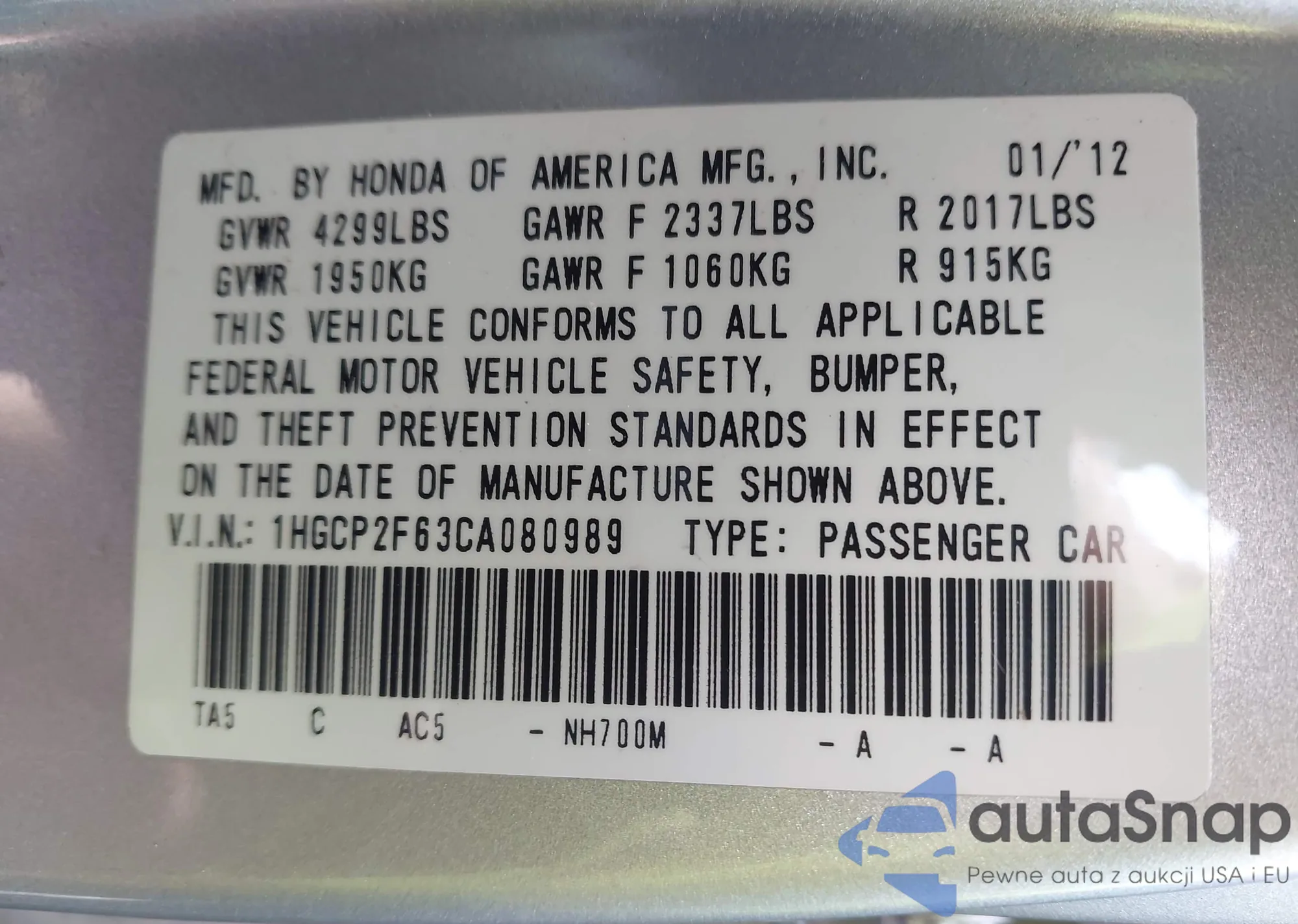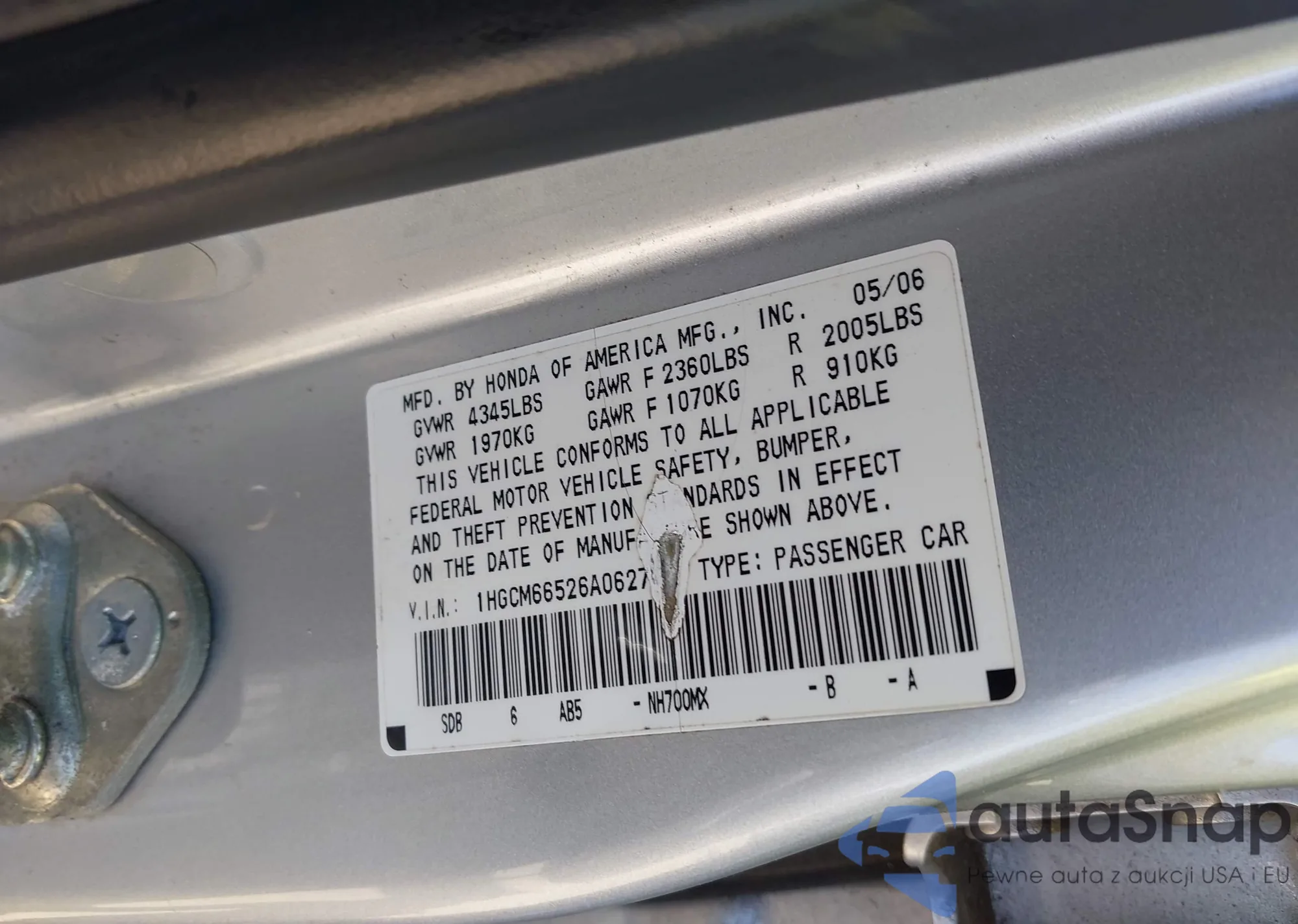 LOT: 43220049 VIN: 1HGCM56344A013576