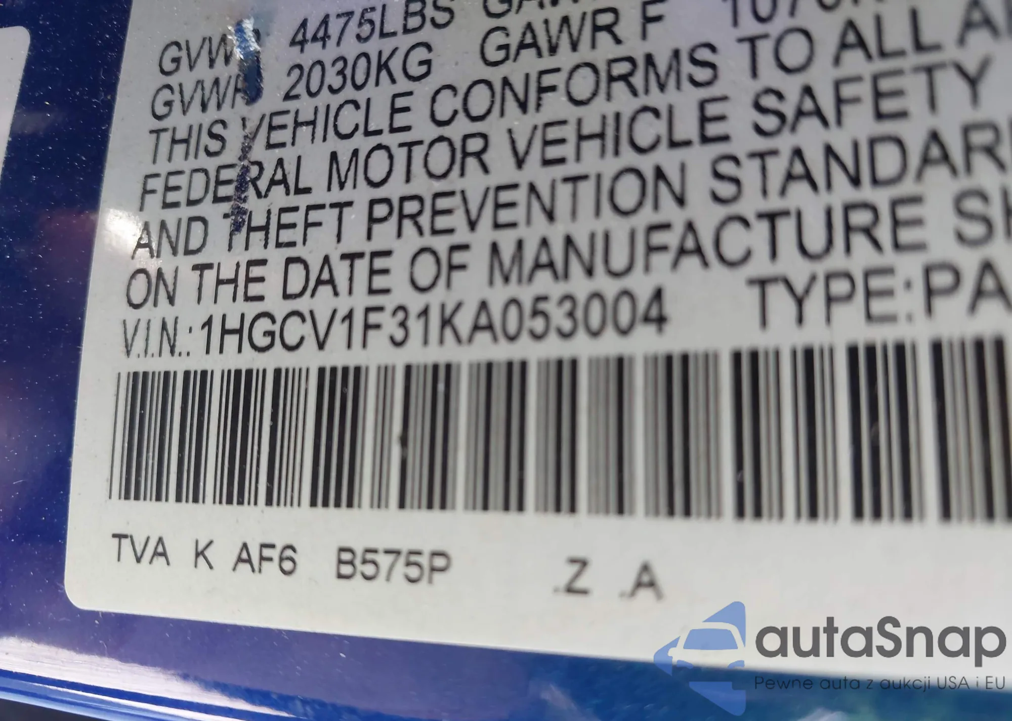 • VIN 1HGCV1F31KA053004
