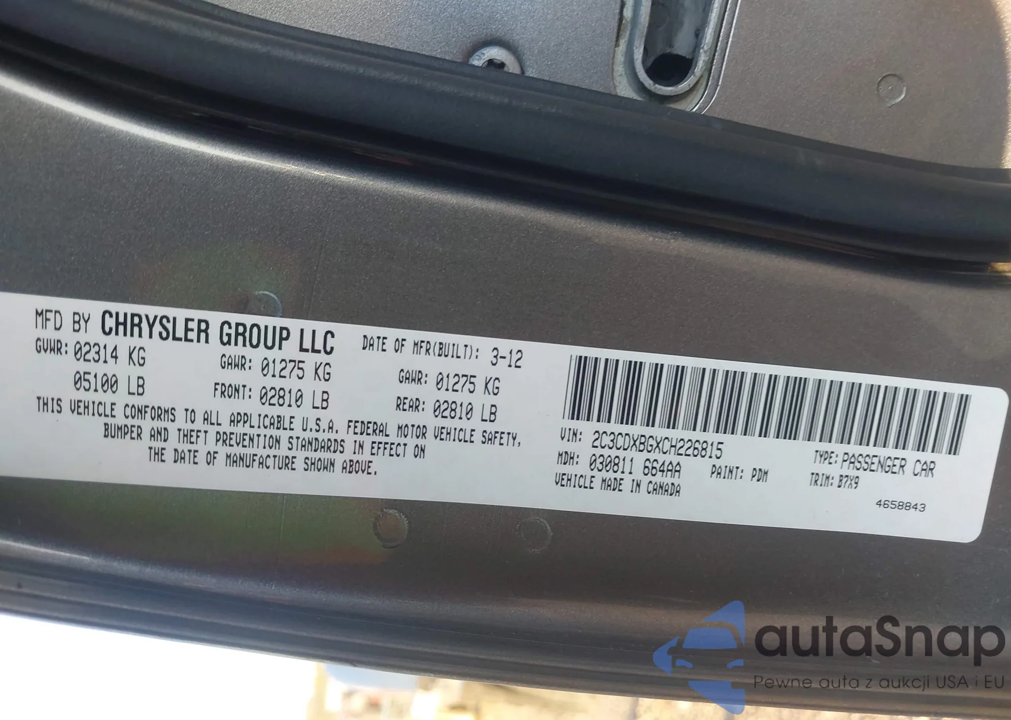 LOT: 43209581 VIN: 2C3CDXBGXCH226815