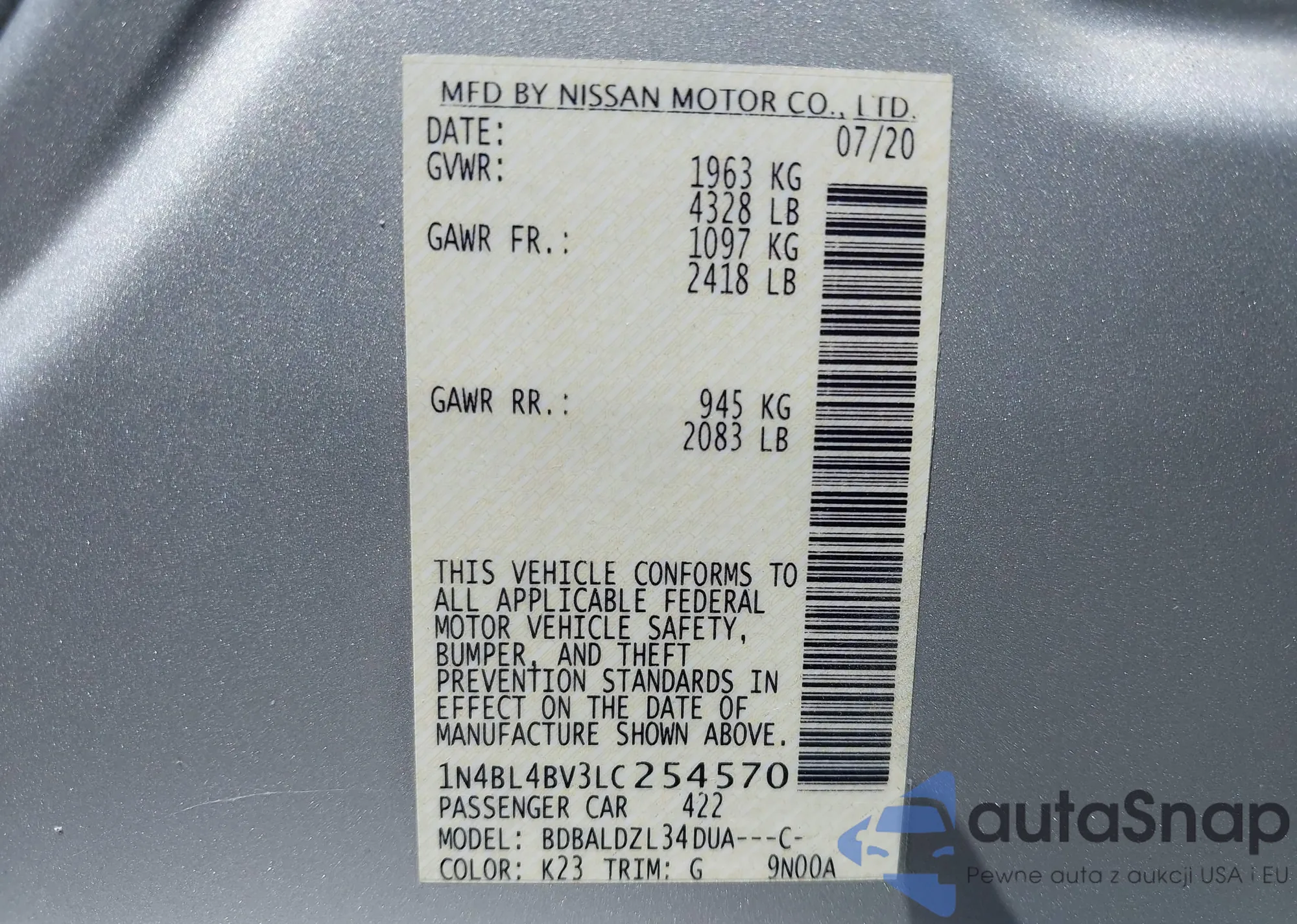 LOT: 42693509 VIN: 1N4BL4BV3LC254570