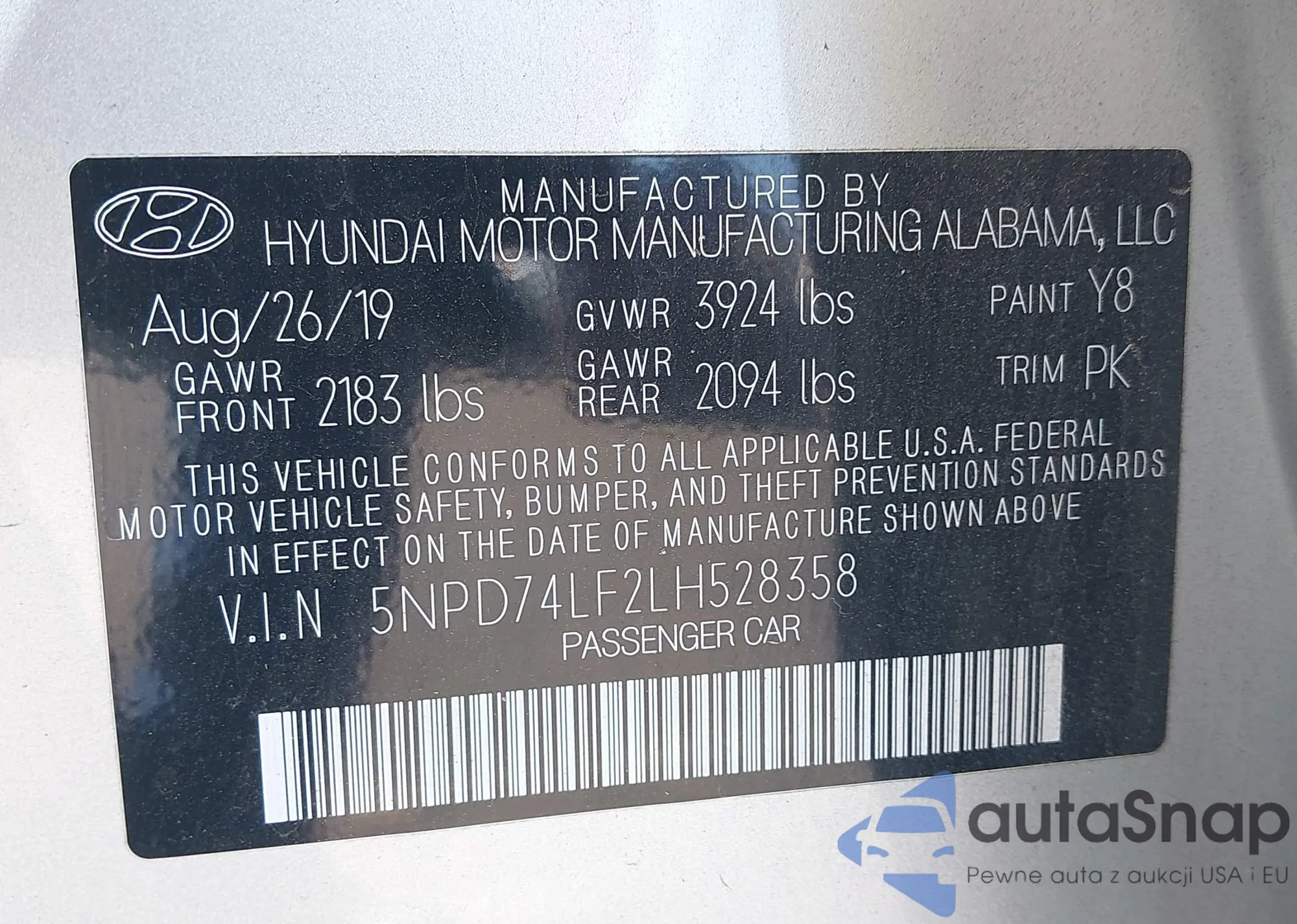 LOT: 43324471 VIN: 5NPEH4J2XLH034766