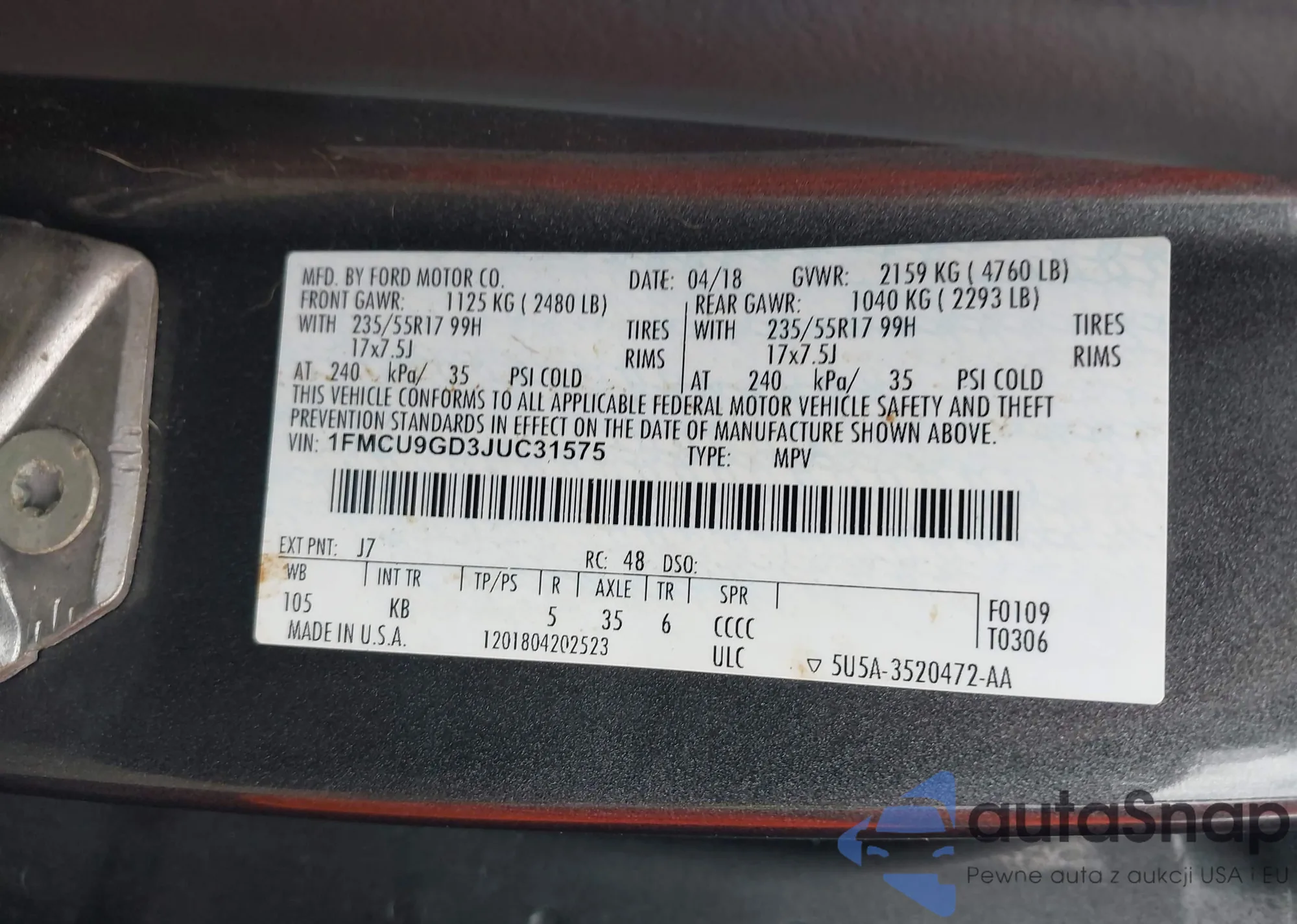 • VIN 1FMCU9GD3JUC31575