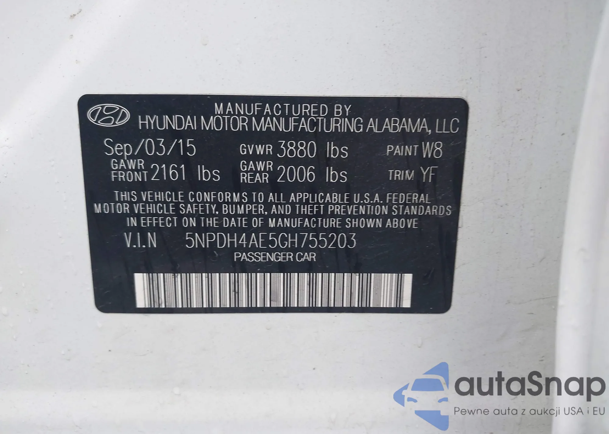 LOT: 43399225 VIN: 5NPDH4AE5GH755203
