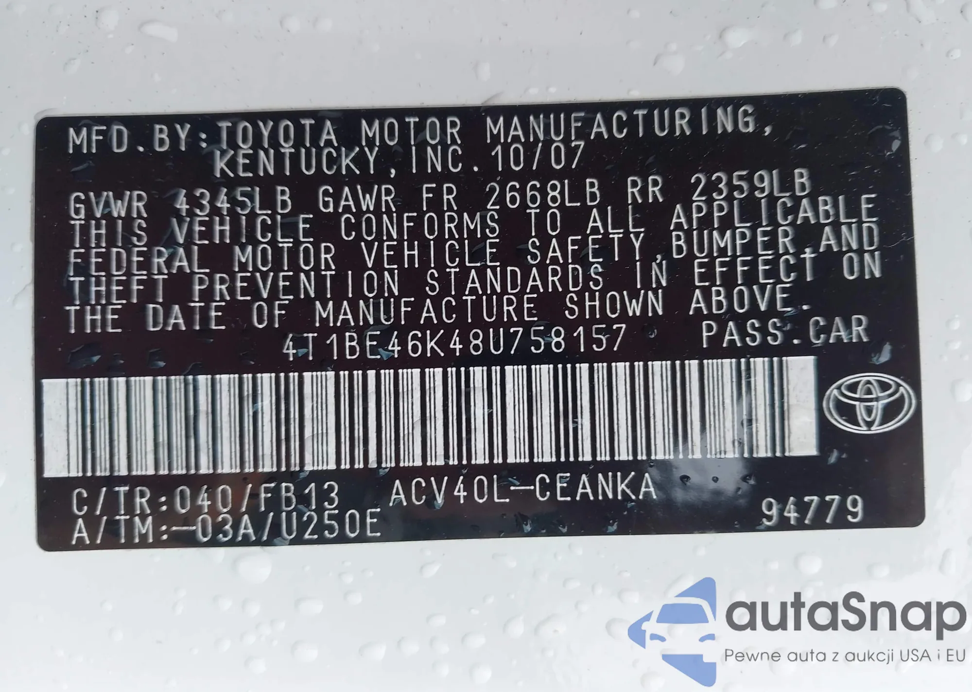 LOT: 43398435 VIN: 4T1BE46K48U758157