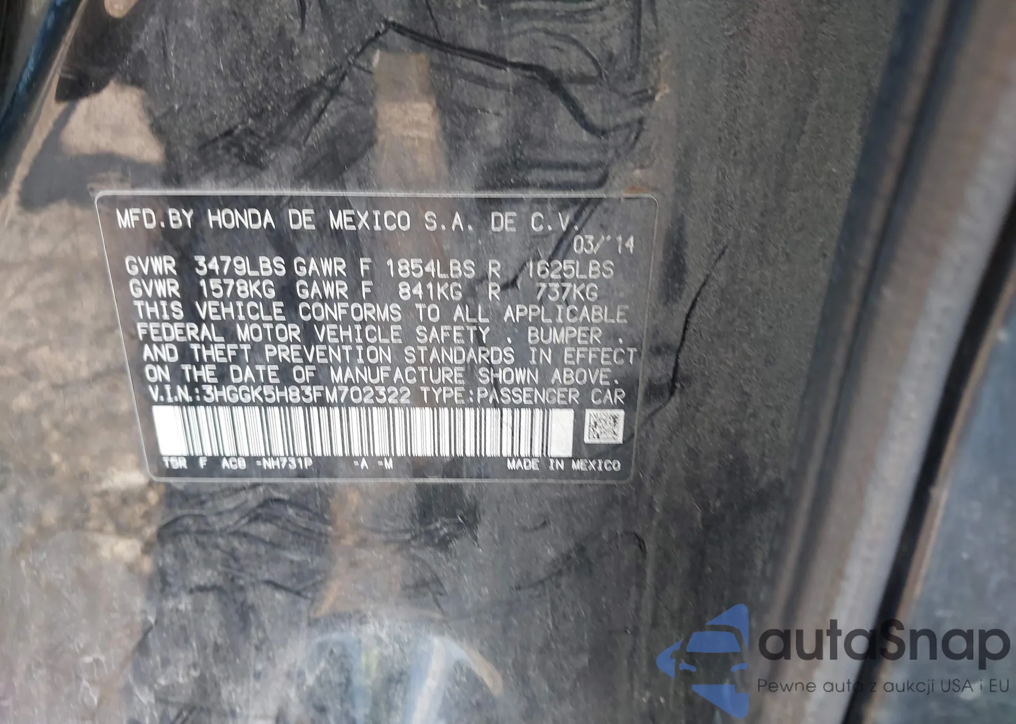• VIN 3HGGK5H83FM702322