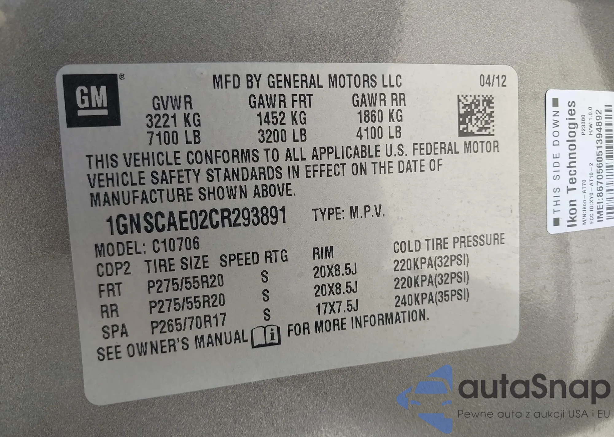 LOT: 43426015 VIN: 1GNSCAE02CR293891