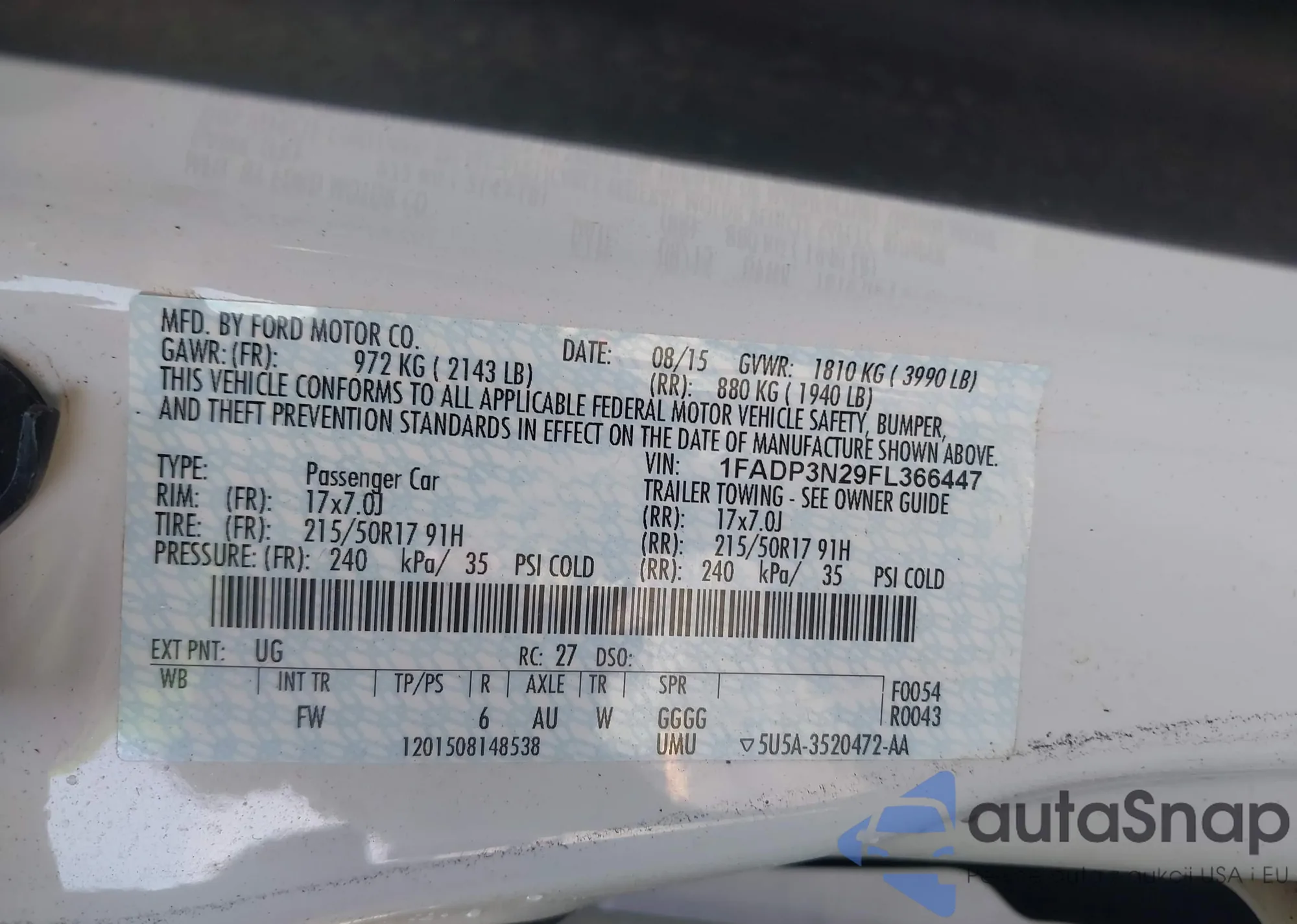 LOT: 43274669 VIN: 1FADP3N29FL366447