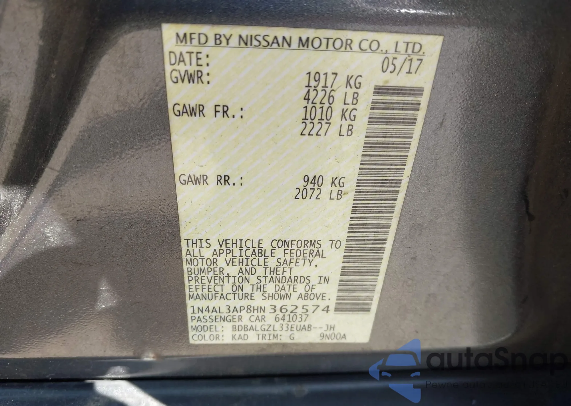 LOT: 43297908 VIN: 1N4AL3AP8HN362574