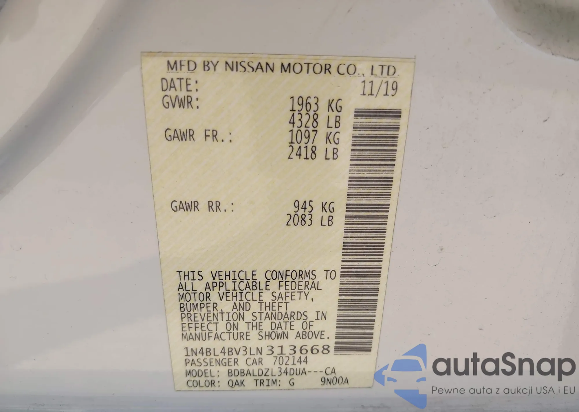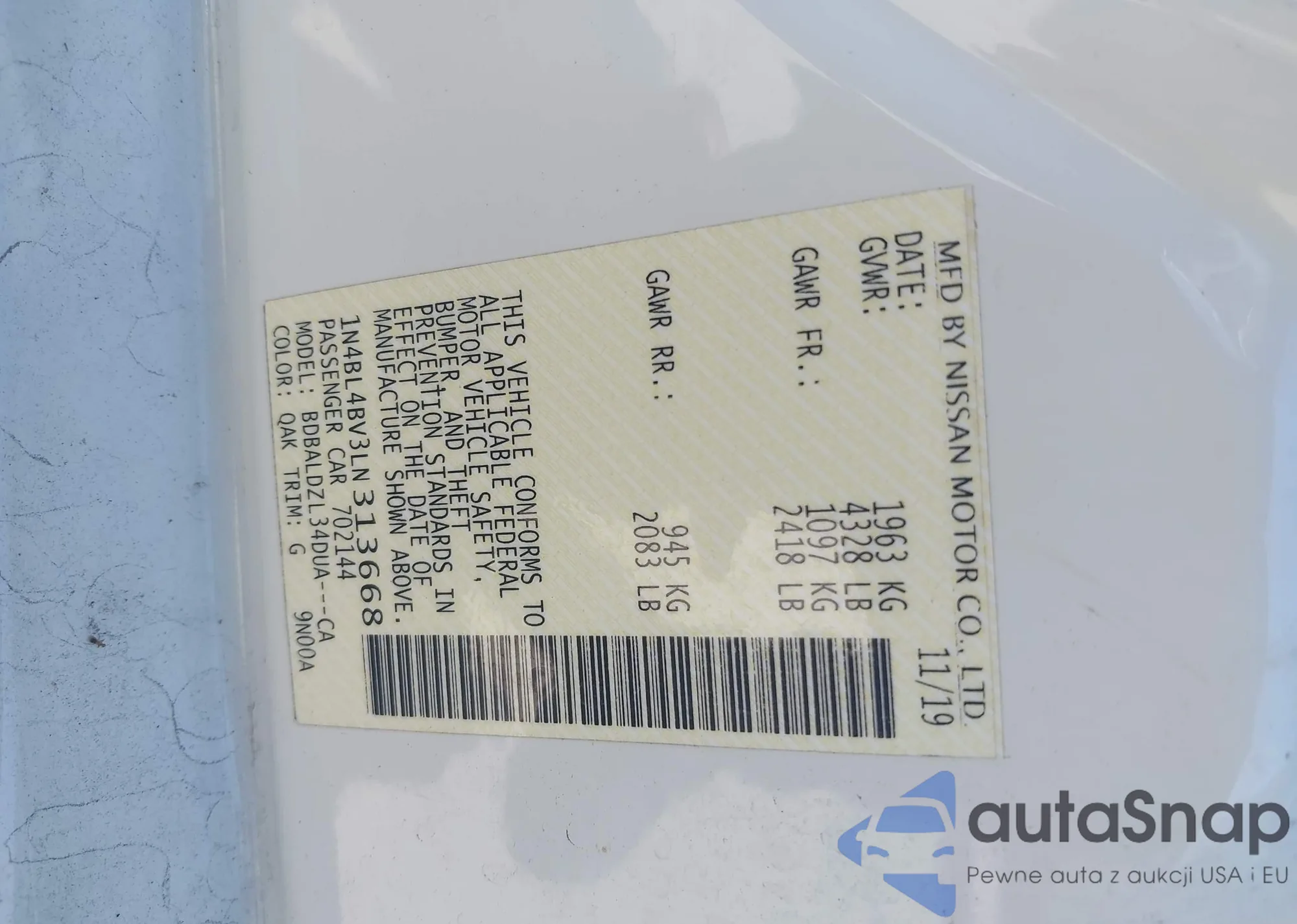 LOT: 43326152 VIN: 1N4BL4BV3LN313668