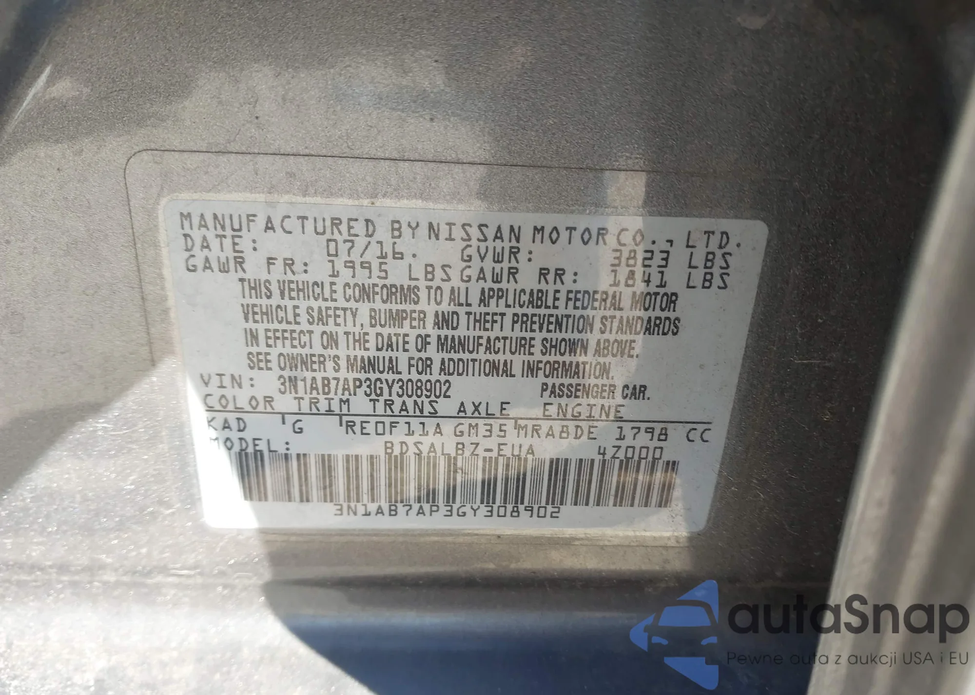 LOT: 43493802 VIN: 3N1AB7AP3GY308902