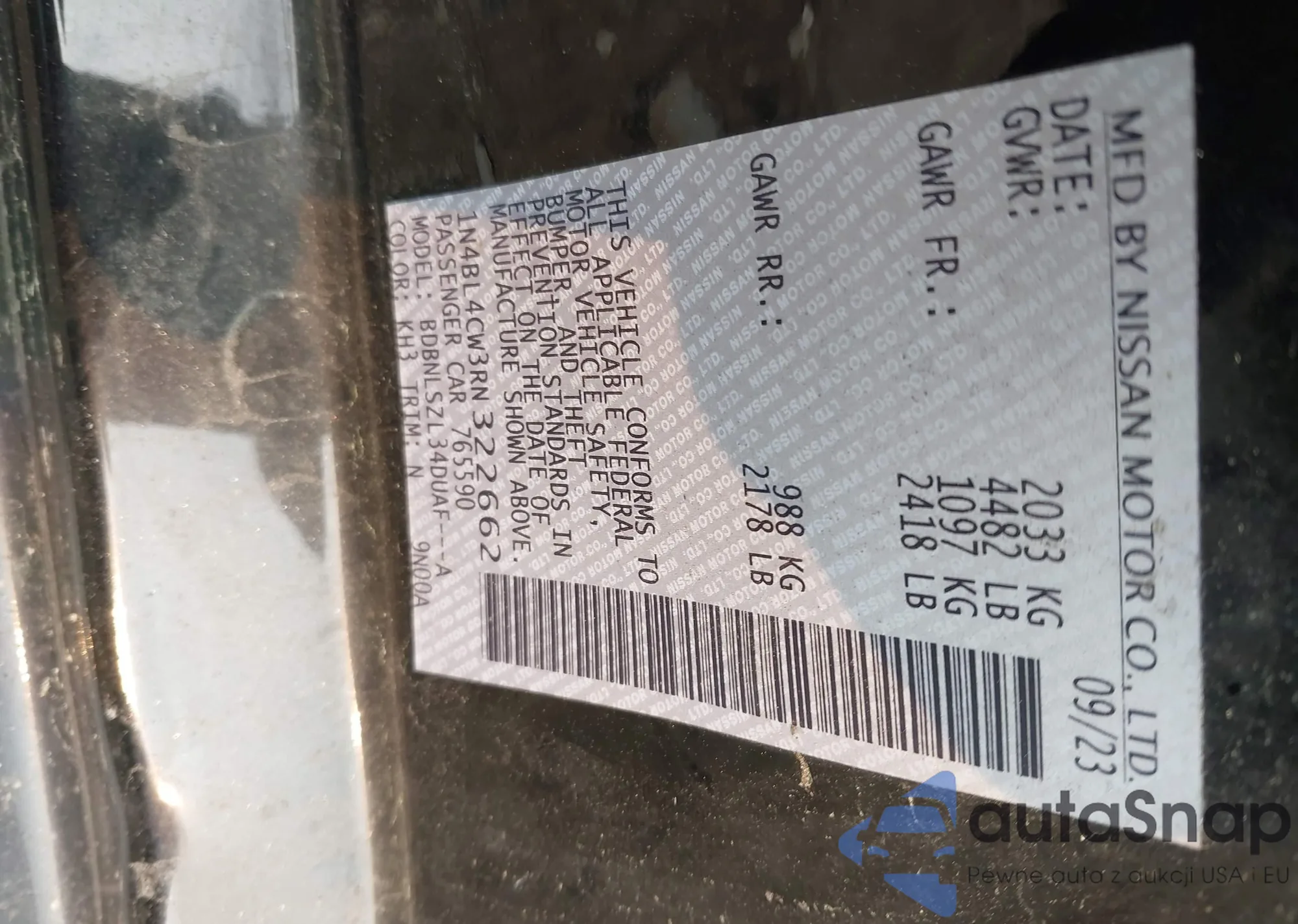 LOT: 42881119 VIN: 1N4BL4CW3RN322662