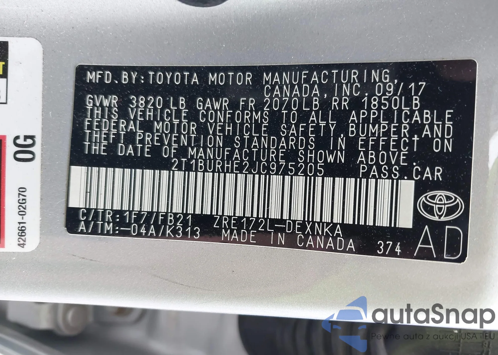 LOT: 43173858 VIN: 2T1BURHE2JC975205
