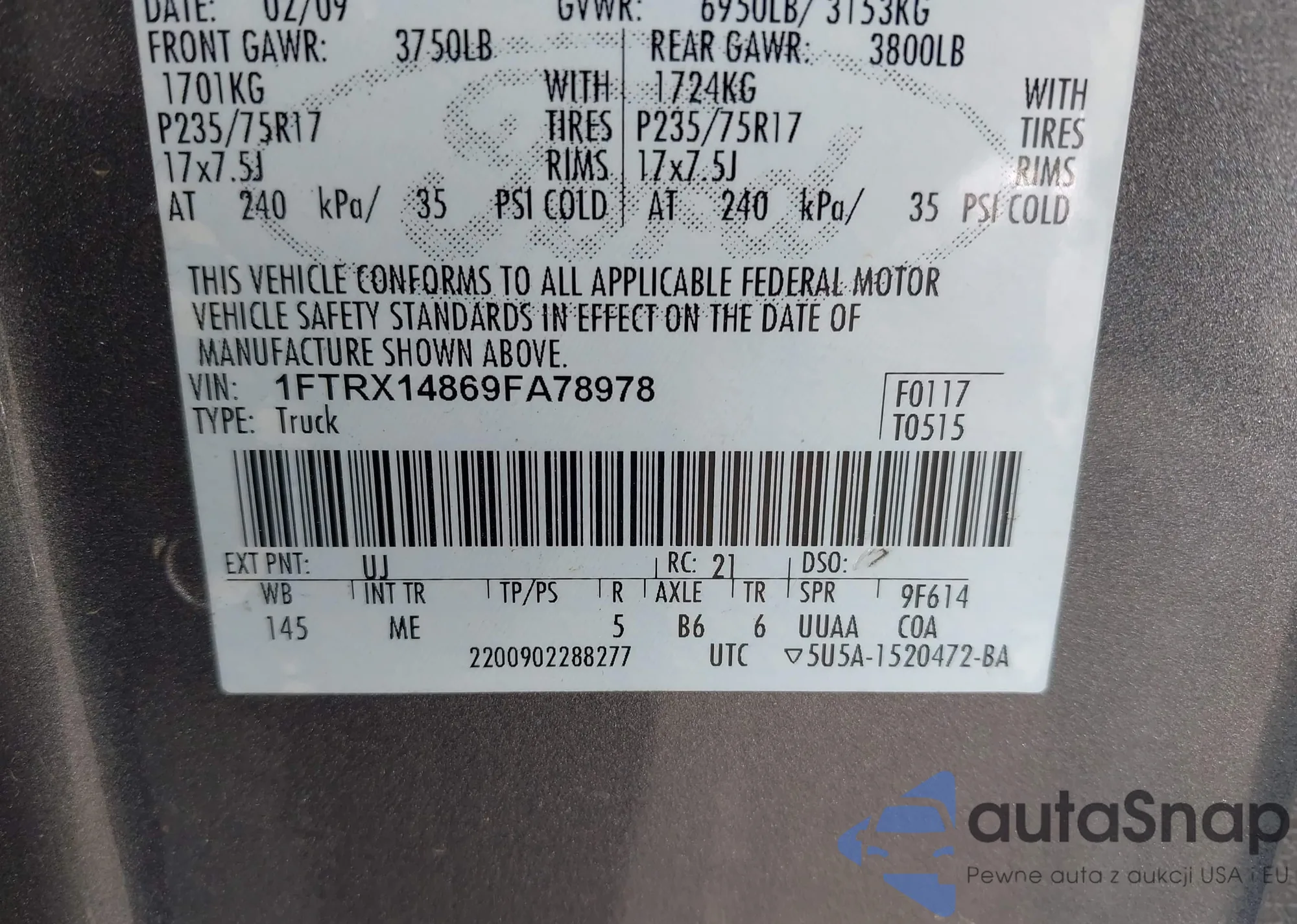LOT: 43328739 VIN: 1FTRX14869FA78978