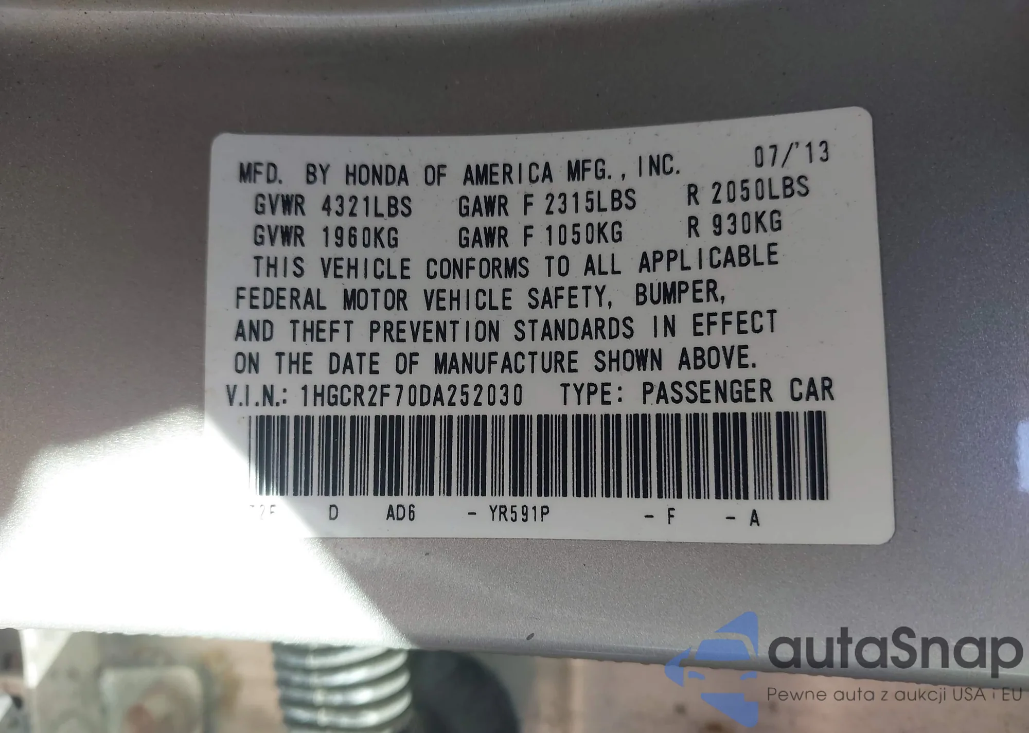• VIN 1HGCR2F70DA252030