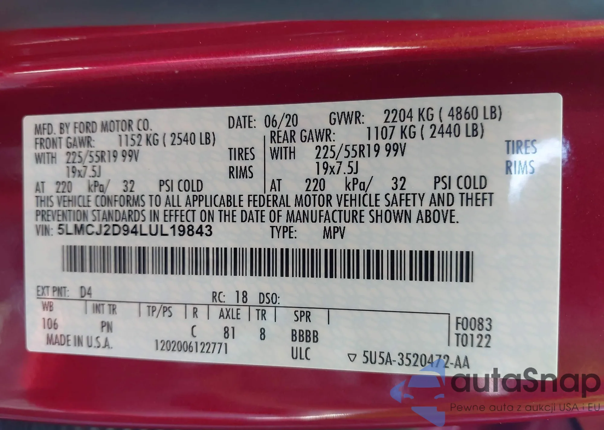 LOT: 43333550 VIN: 5LMCJ2D94LUL19843