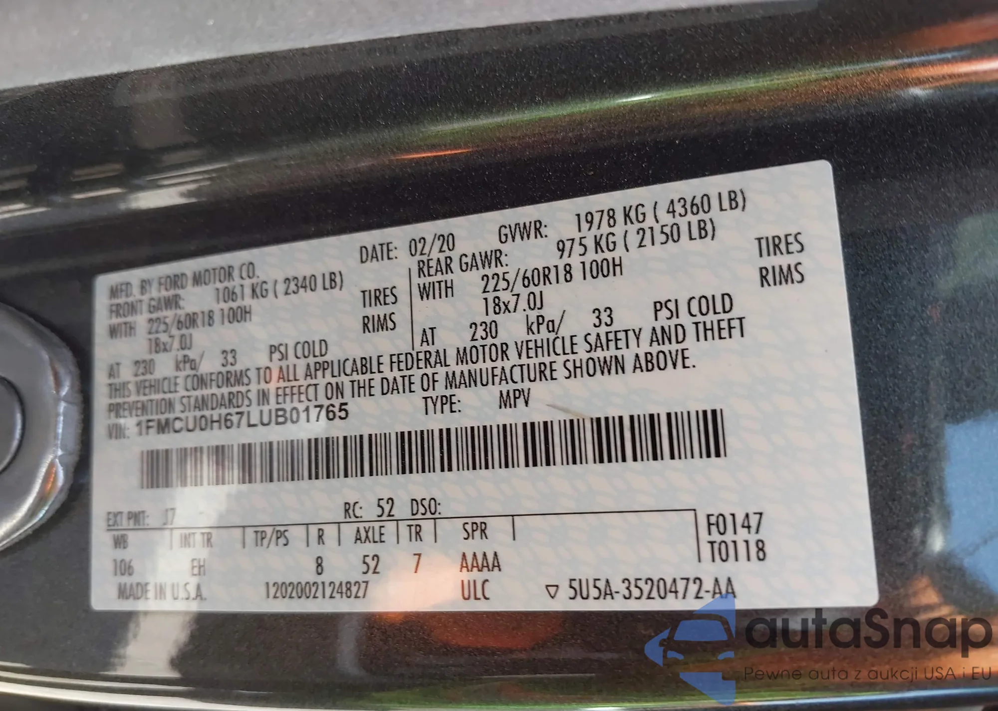 • VIN 1FMCU9GD2HUE51218