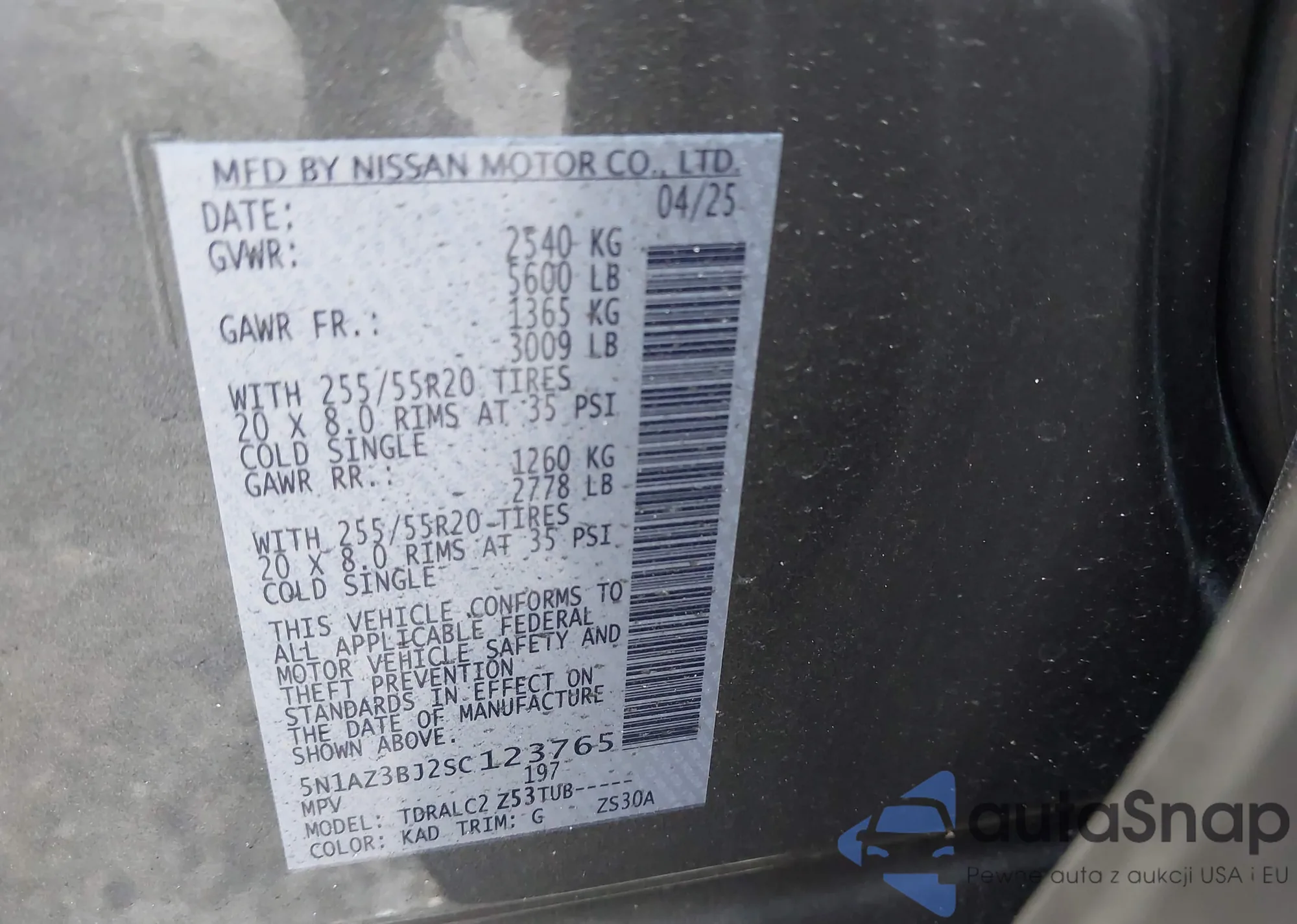 • VIN 5N1AZ3BJ2SC123765