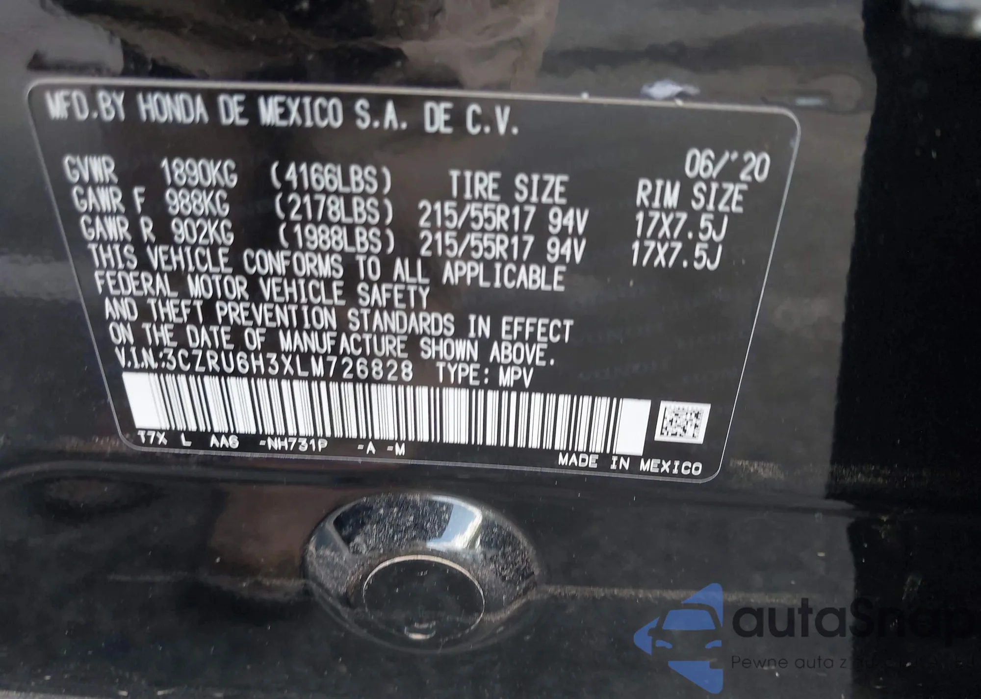 • VIN 3CZRU6H3XLM726828