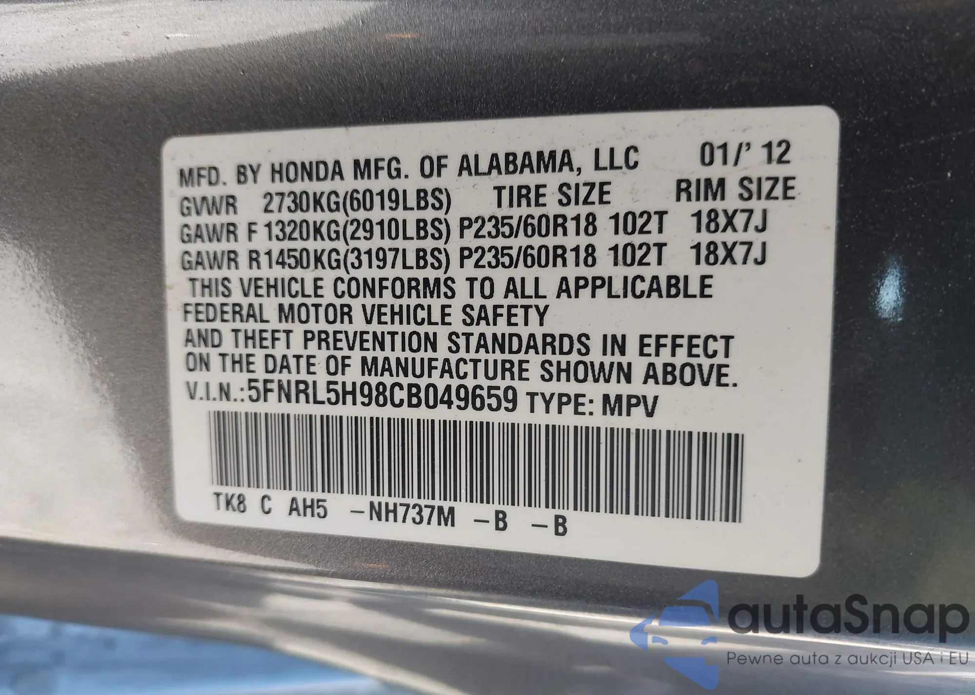 LOT: 43420065 VIN: JHLRE485X7C018131