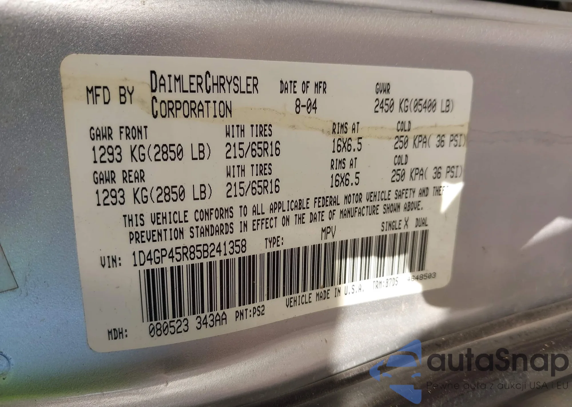 • VIN 1D4GP45R85B241358