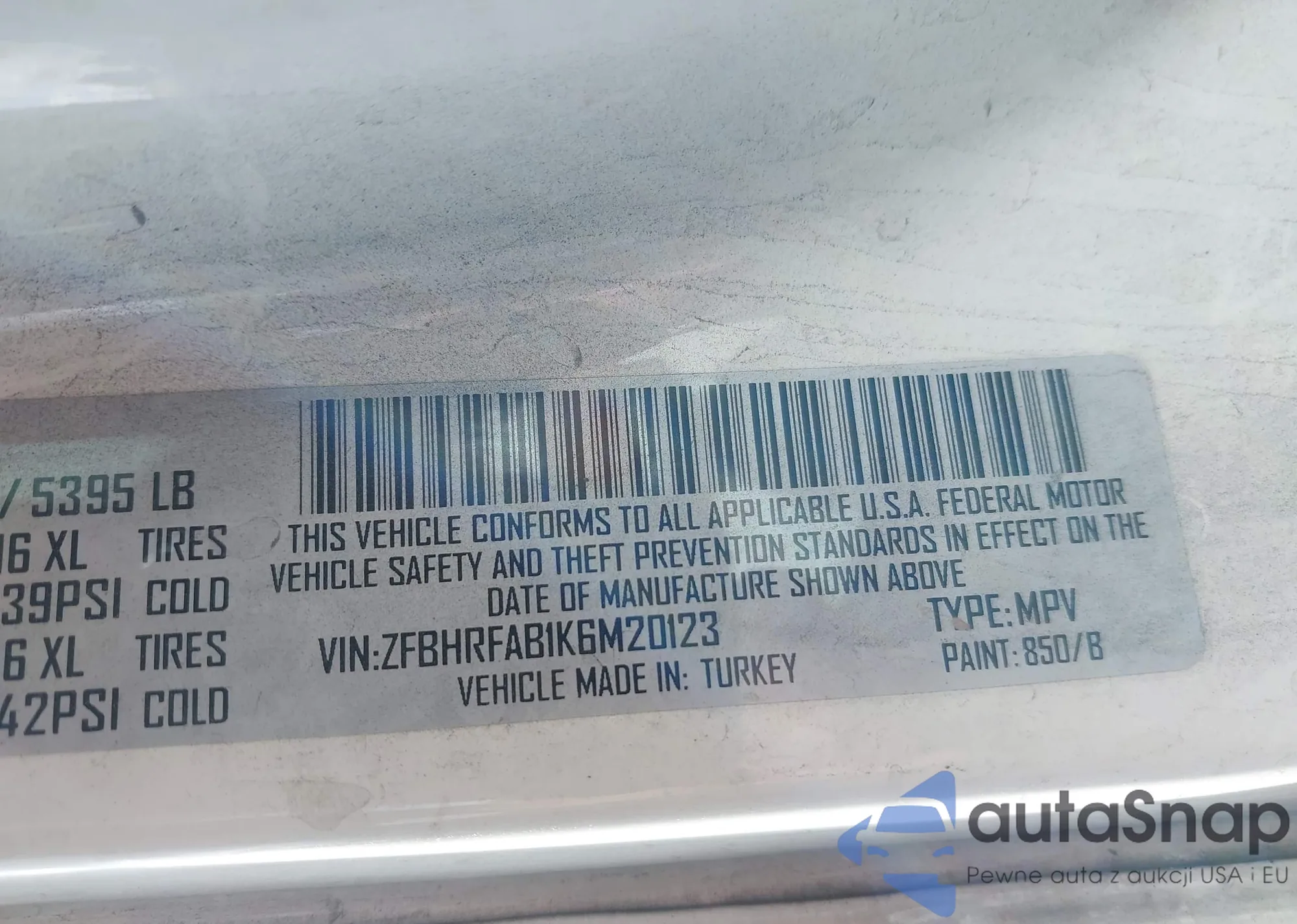 LOT: 43450026 VIN: ZFBHRFAB1K6M20123