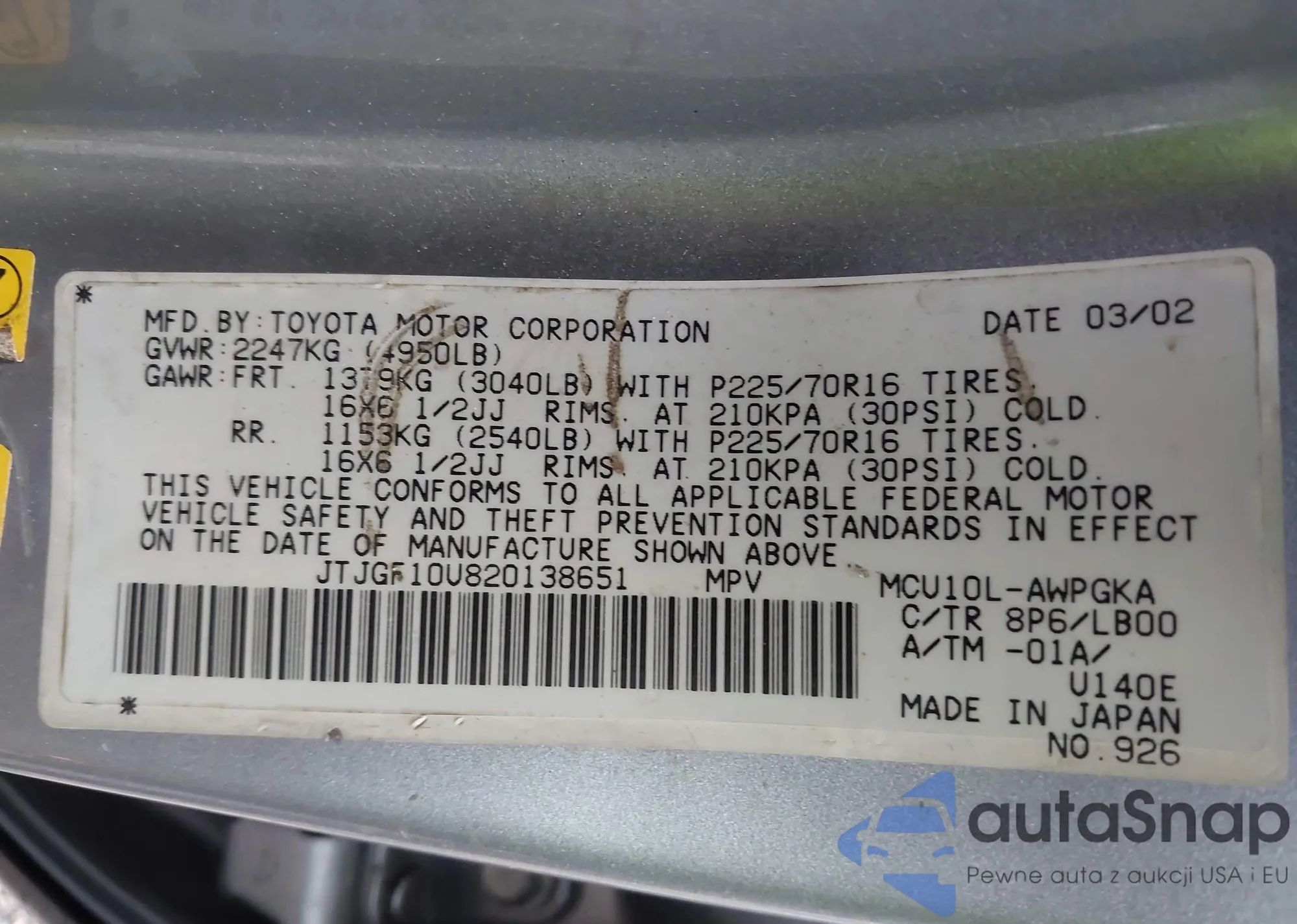 LOT: 43385112 VIN: JTJGF10U820138651