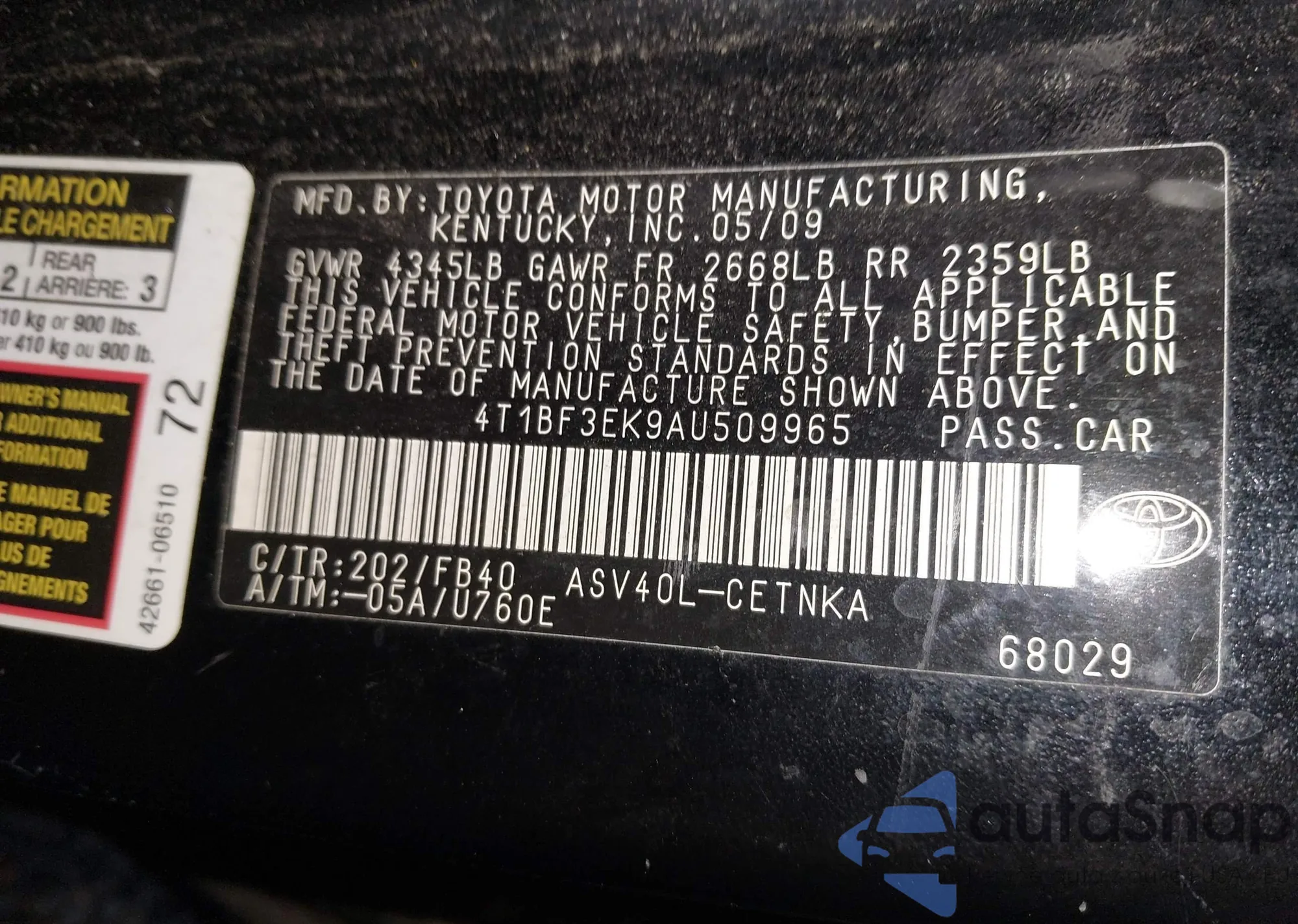 • VIN 4T1BF3EK9AU509965