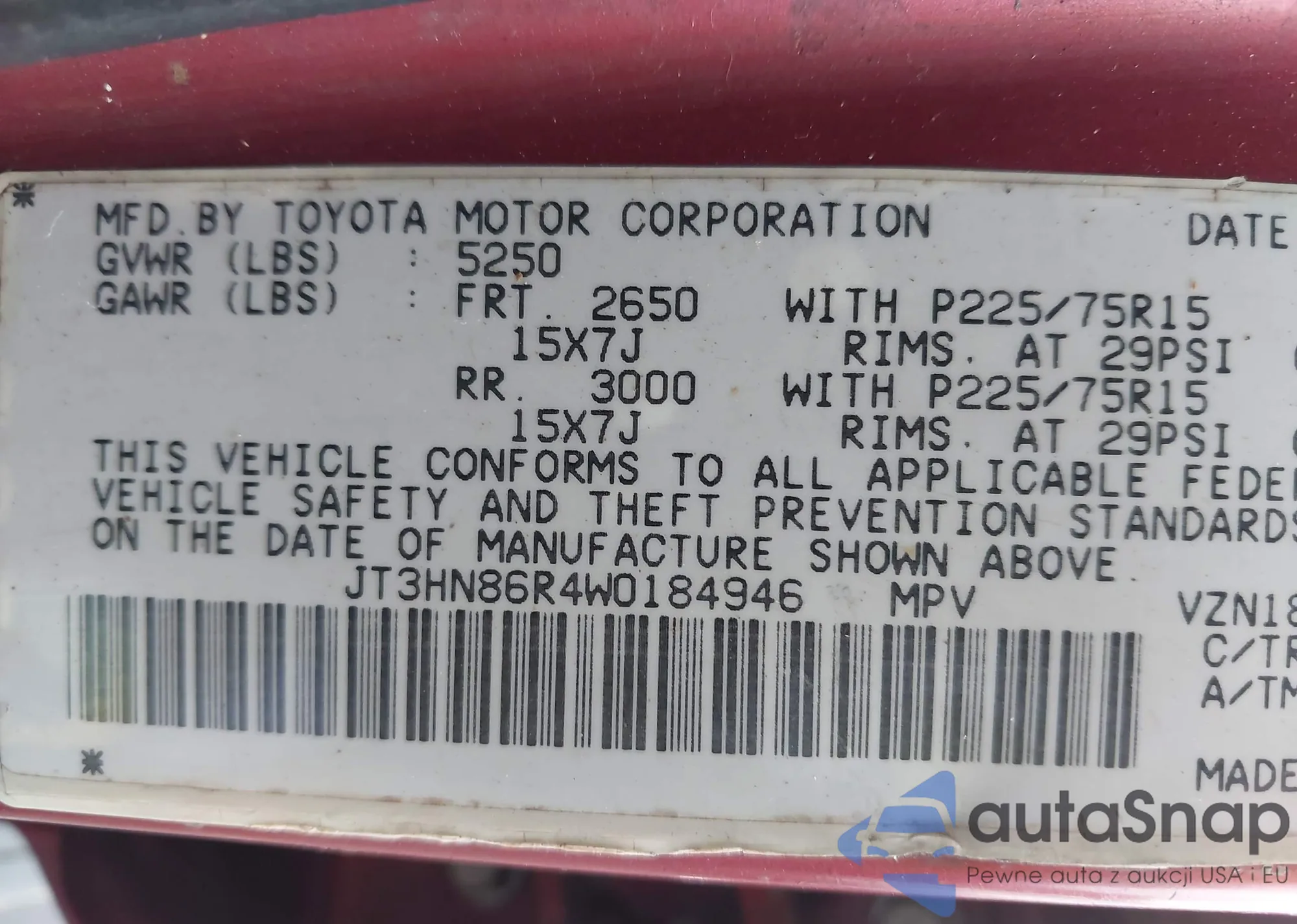 LOT: 43395613 VIN: JT3HN86R4W0184946